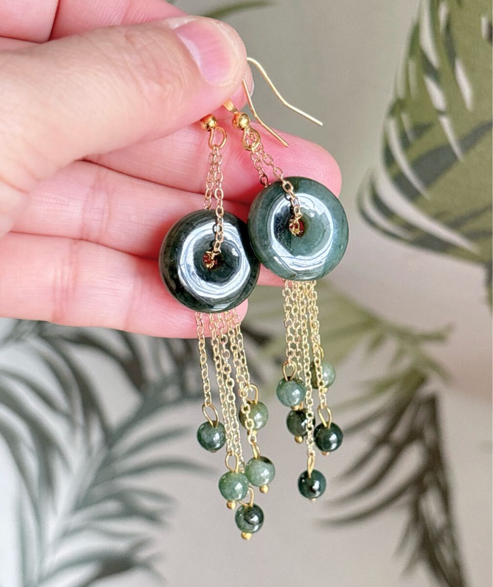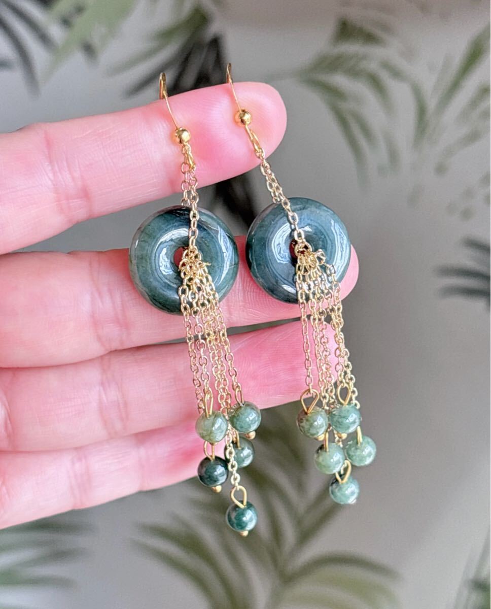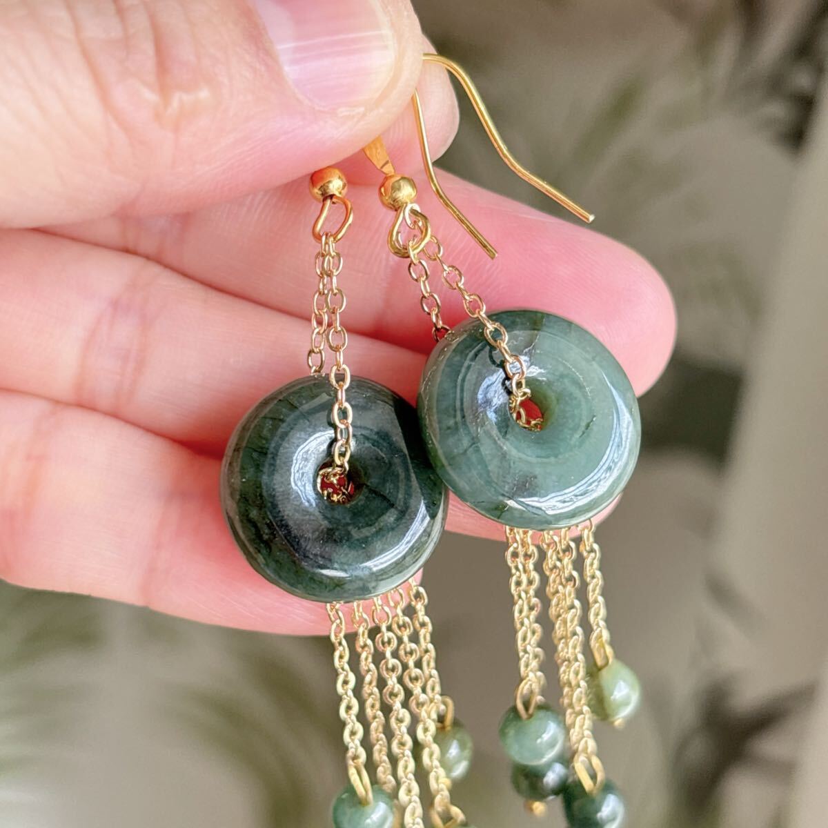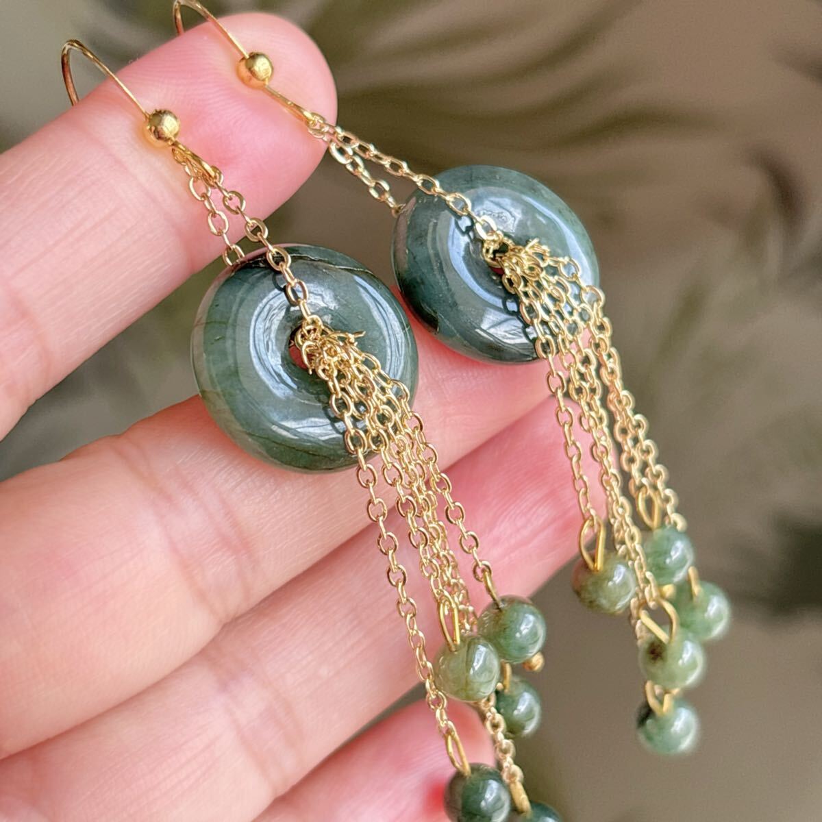 天然石ミャンマー油青種本翡翠(A)のピアスのサイズ:約直径17.8mm*厚さ5mm