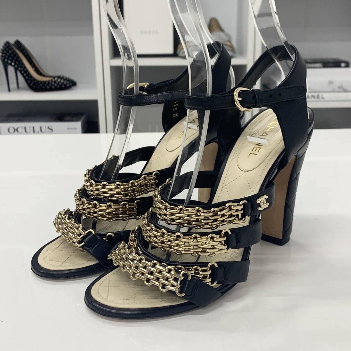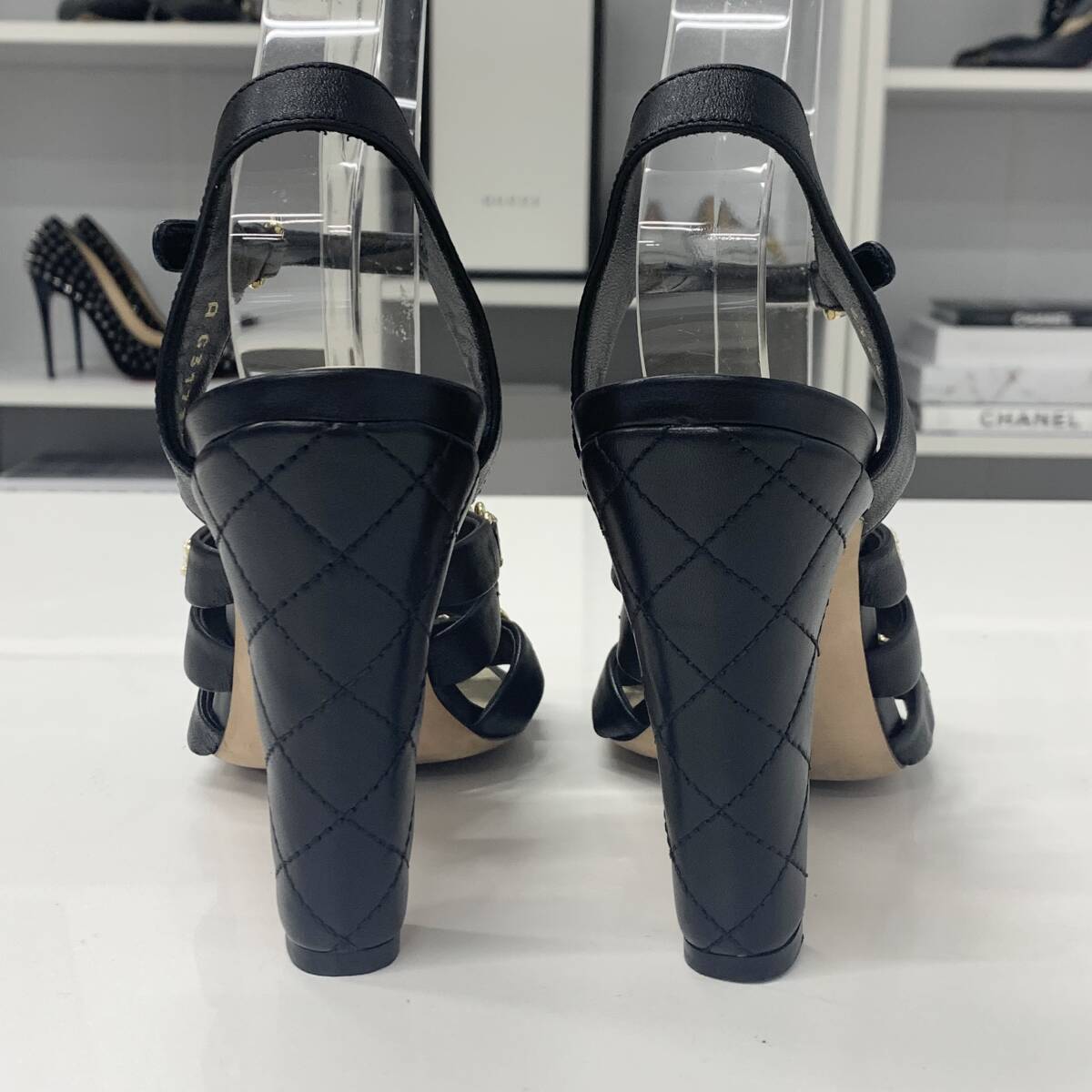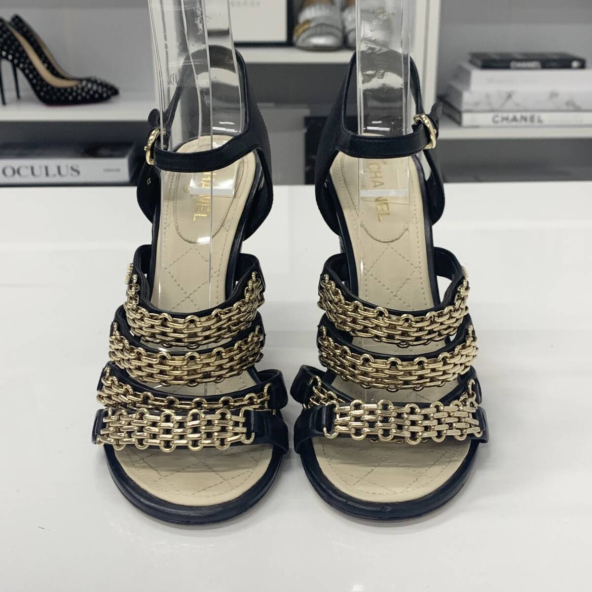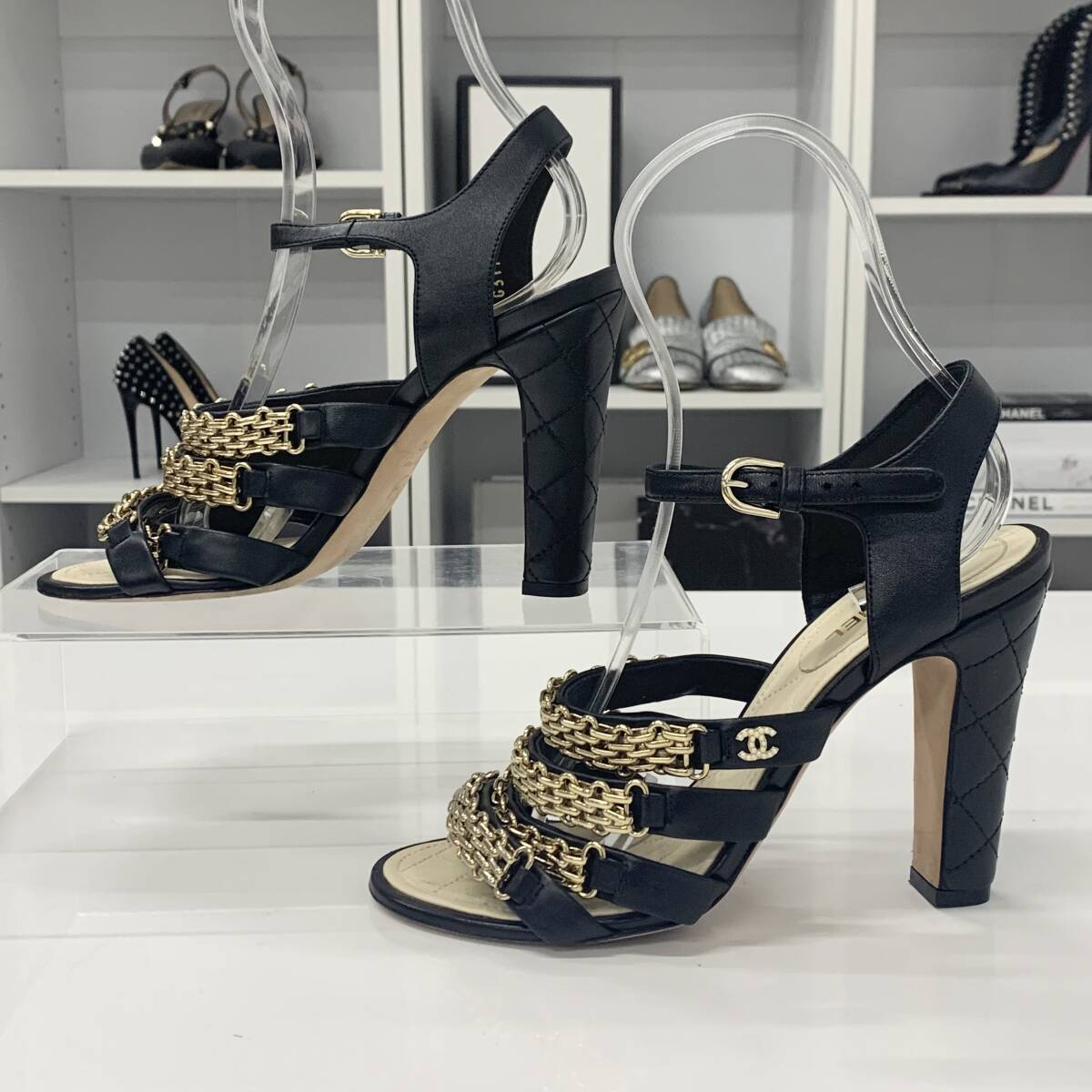 シャネル ココマーク レザー チェーン ストラップ サンダル ブラック