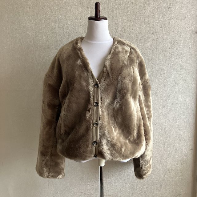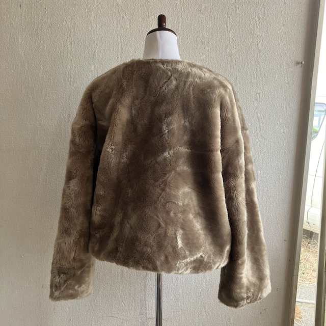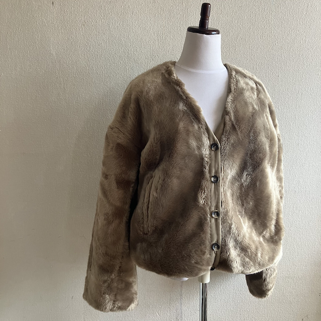 お色はモカ系でカフェオレのような淡いブラウンとベージュの間のようなお色、サラッとしたナイロン系生地と起毛のもこもこしたボアのリバーシブルです