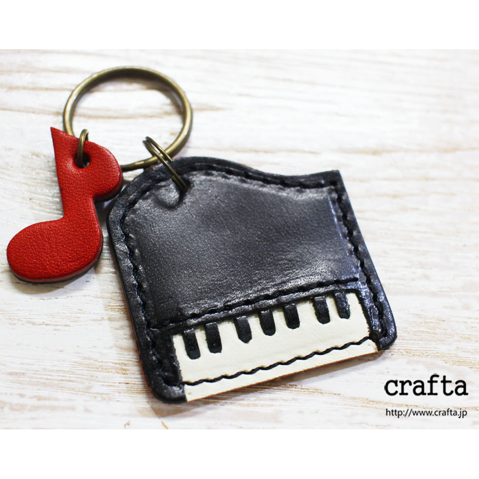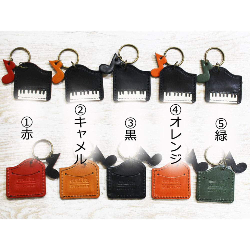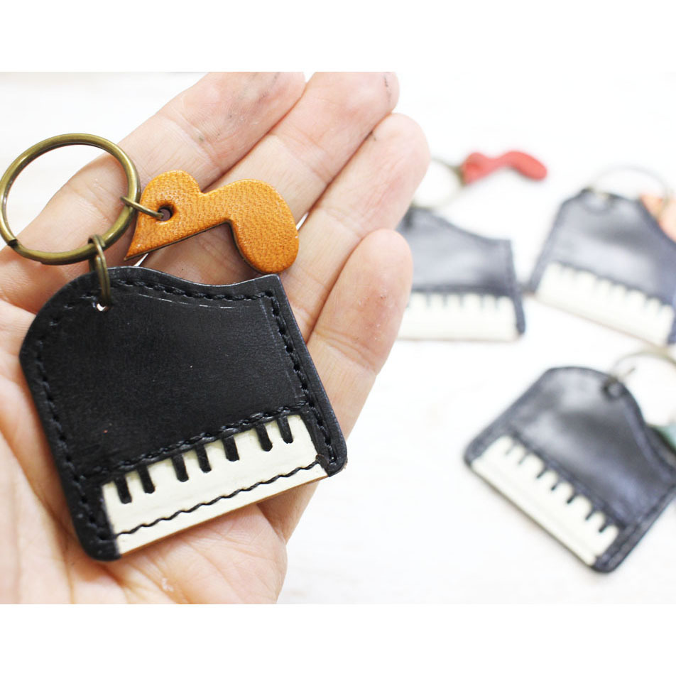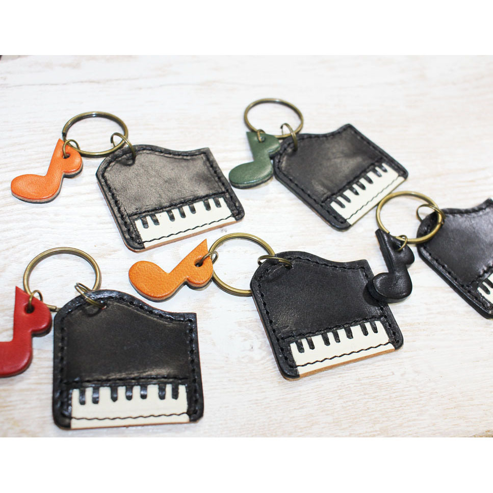 高品質な牛ヌメ革製の、ピアノをモチーフにした手のひらサイズのキーホルダーです。当店の他のキーホルダーと同じく、500円玉を2枚収納できます。もちろん他の硬貨も収納可能です。切り込みを閉じれば落ちることはありませんので、もしものときの電車代など入れておくのに丁度良いかと思います。鍵盤部分は細かく裁断した革のパーツを組み合わせて作られているので、プリントとは質感、立体感が違います。音符型のタグもポイントです。色は背面とタグの色違いで5パターンご用意しました。ピアノ好きな方へのちょっとしたプレゼントにも最適です。