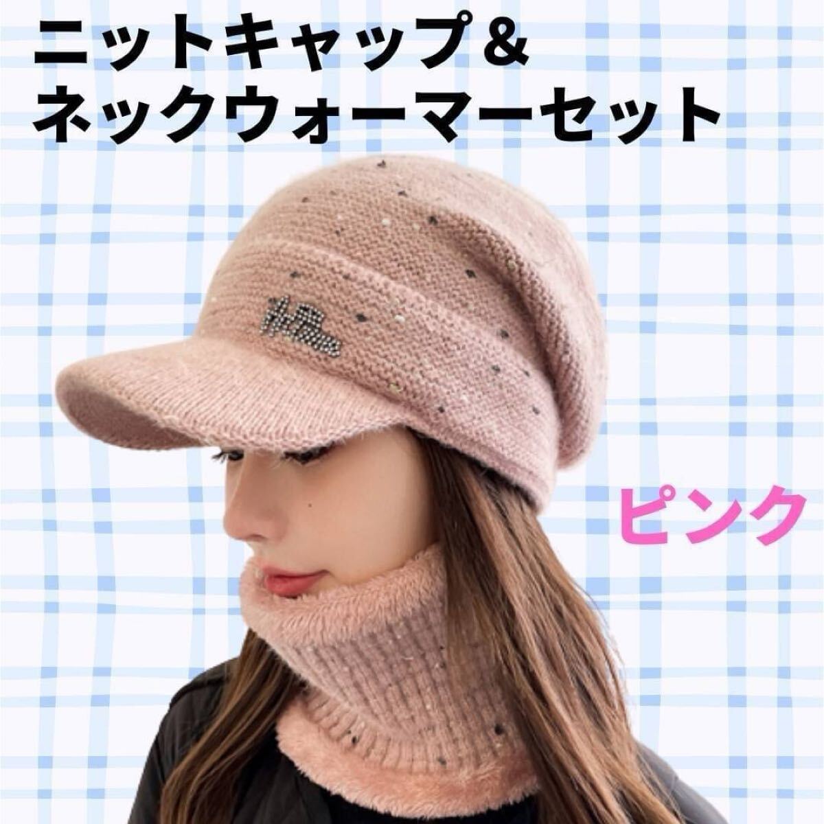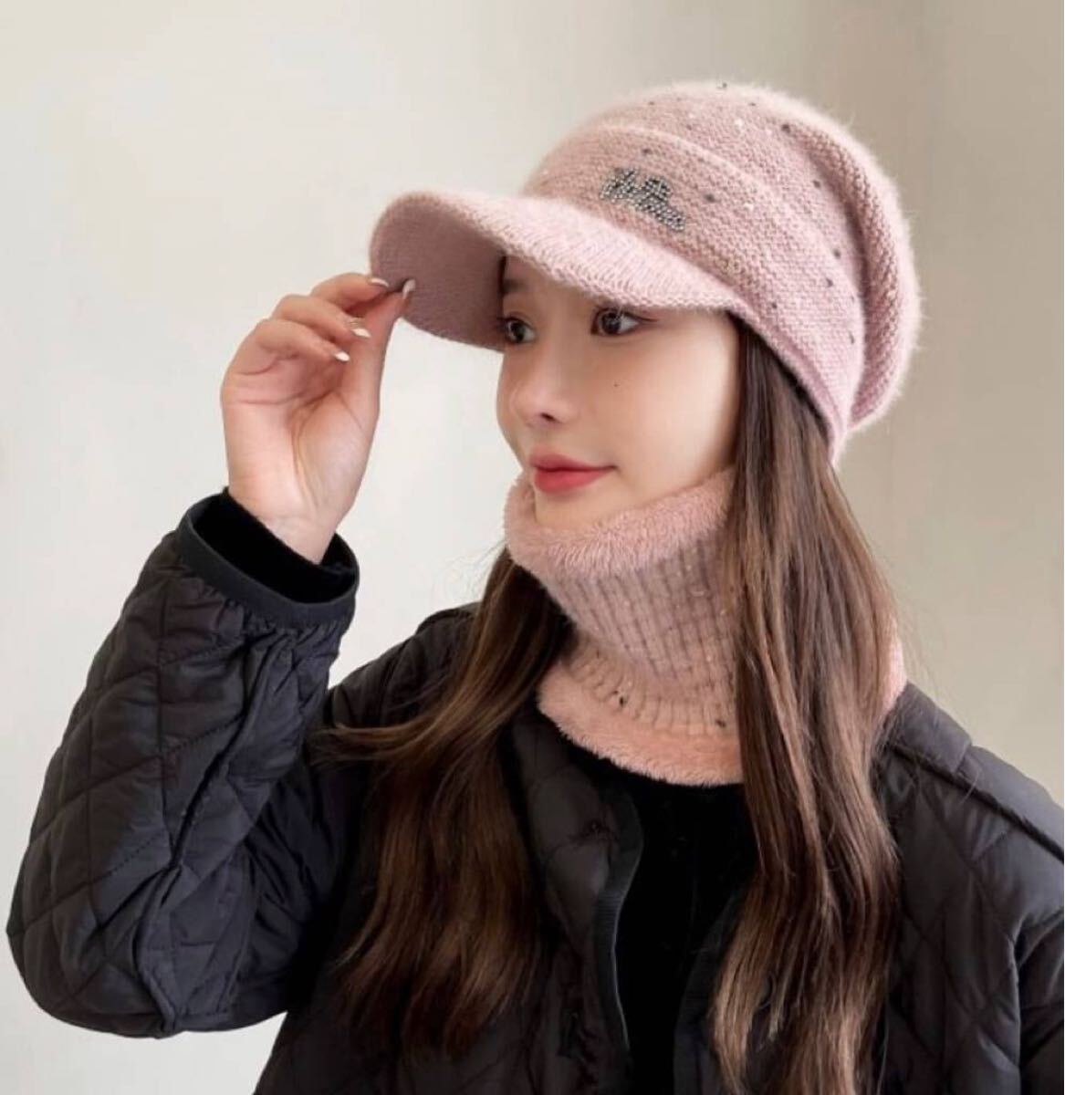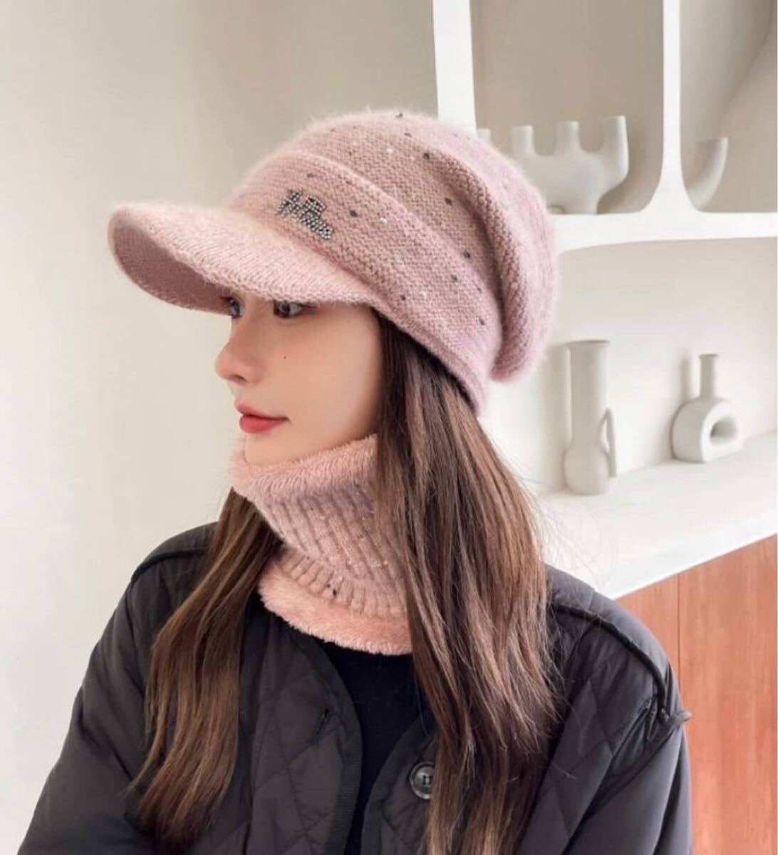 つば付きのニットキャップと