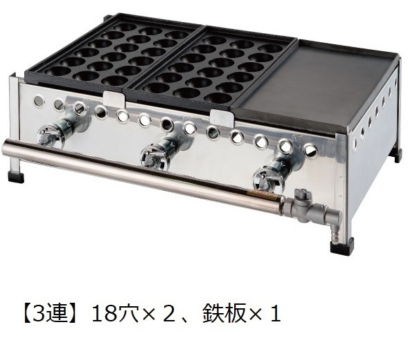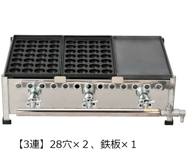 たこ焼プレート2枚+鉄板1連メーカー・型式 伊東金属工業所 外形寸法 間口595 奥行358 高さ190(mm) ガス消費量 プロパンガス:7.74kw