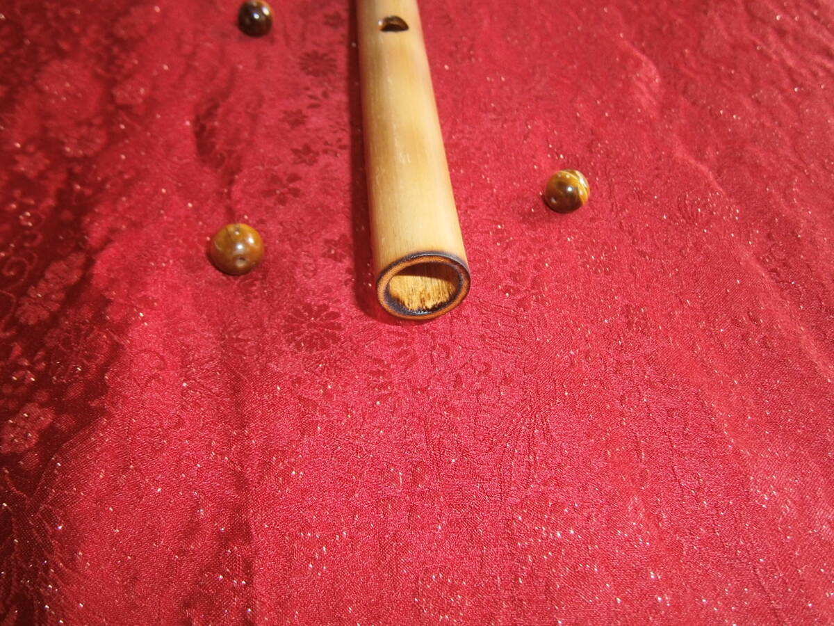 こちらは 焼竹といい、表面だけではなく中まで火が入っています。そのため、比較的吹きやすく、音量が多く、音に鋭く切れがあります。(音が割れにくい)製作者にとっては、古典調の笛の場合、いかに、吹きやすく、良くなるかが求められます。そこで、いろいろ調査した結果、産地によってや自生する場所や条件によって、さまざまな特性を持つことが分かりました。ある特定の地域に自生し、いくつかの条件を満たした竹を、中までしっかりと焼くと、鳴りの良い笛になることを発見しました。しかも、今まで不可能とされてきた極太で製作しても大甲音が5番まで抜けることも発見しました。(今まで誰もが追い求めてきた極太管の製作に成功しました。)しかし、条件を満たす竹は少ない。