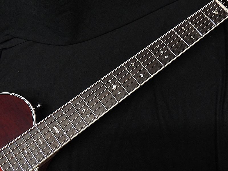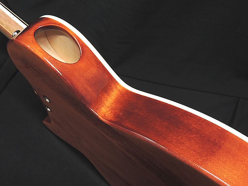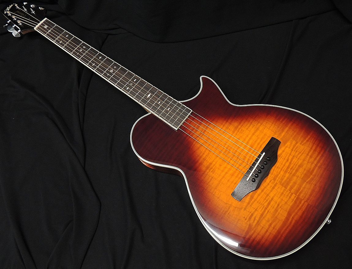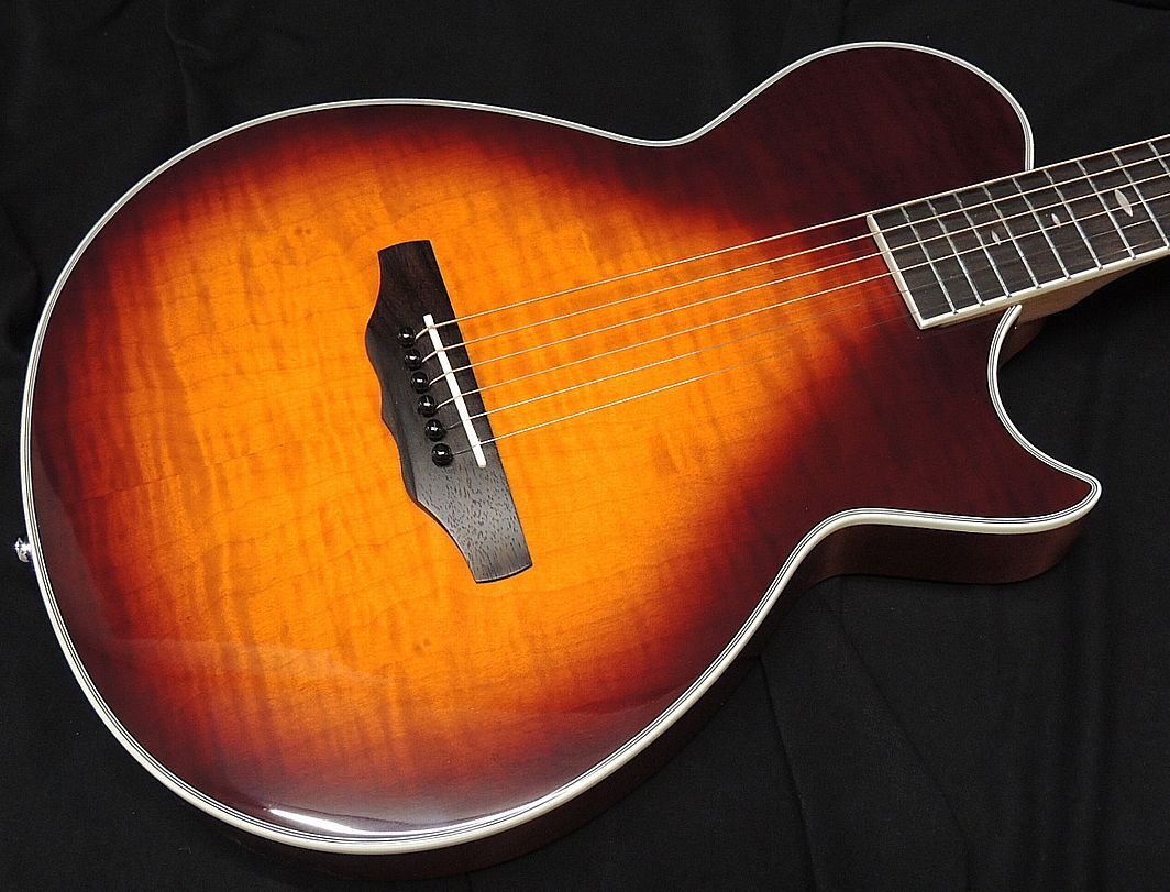 マホガニーをくりぬいたボディにフレイムメイプルトップを組み合わせたエレクトリックアコースティックギター。