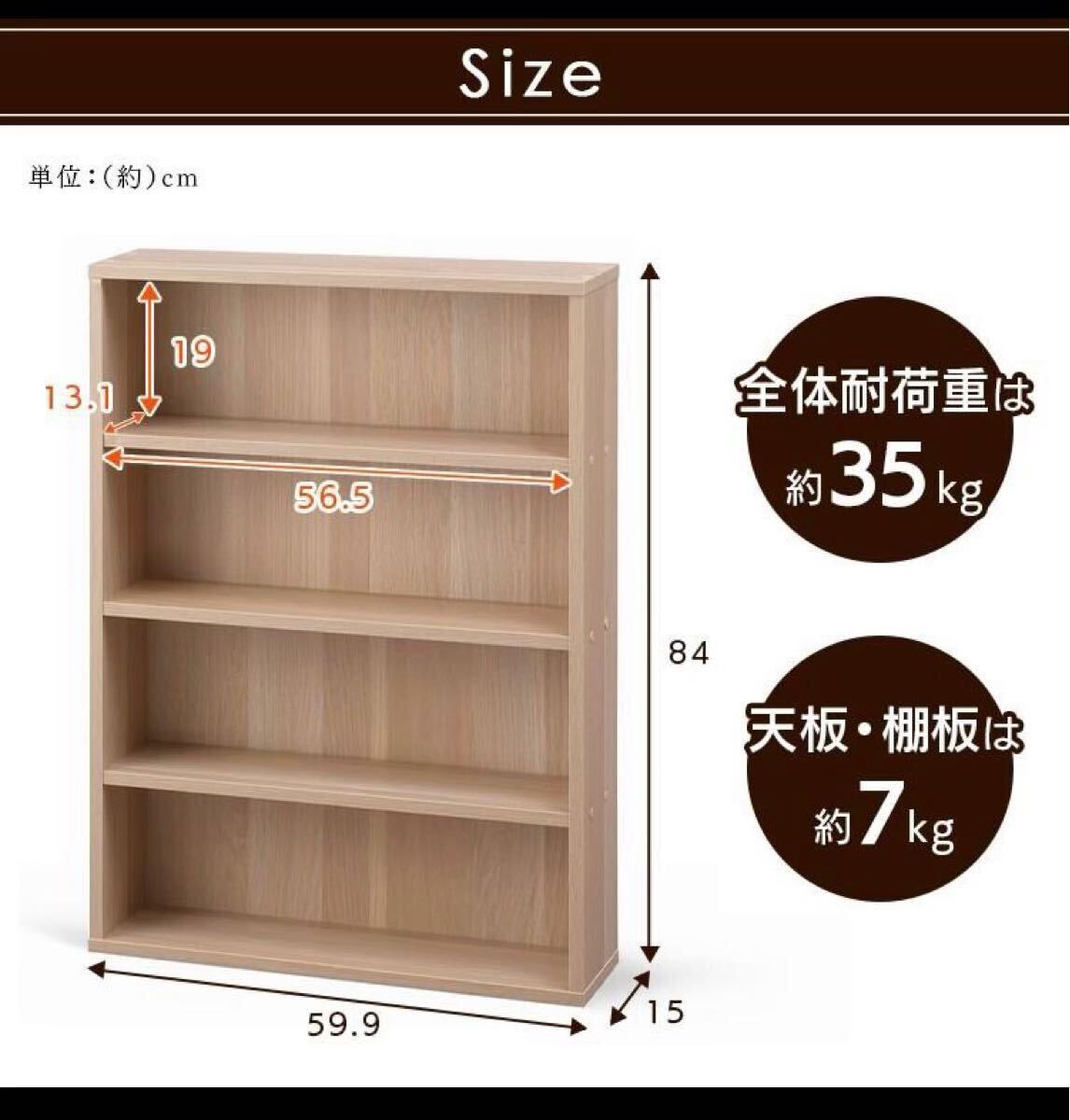 全体耐荷重は約35kg、天板・棚板は約7kg