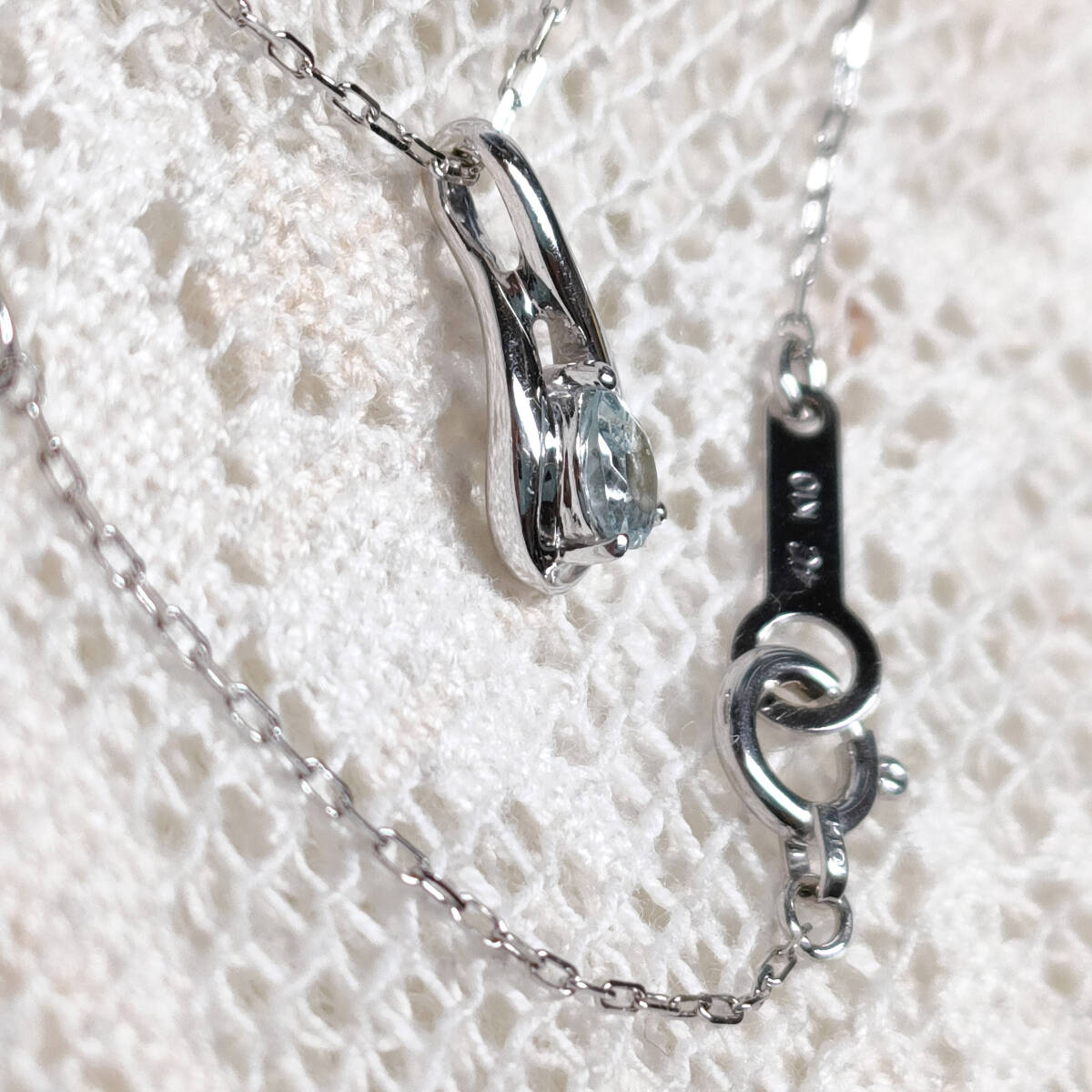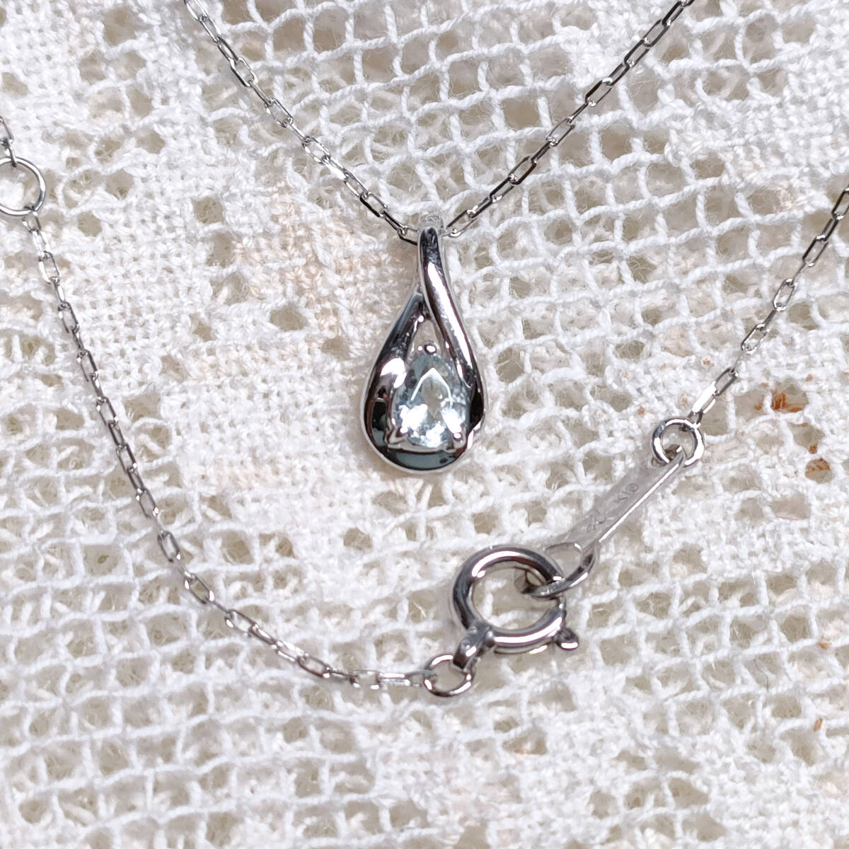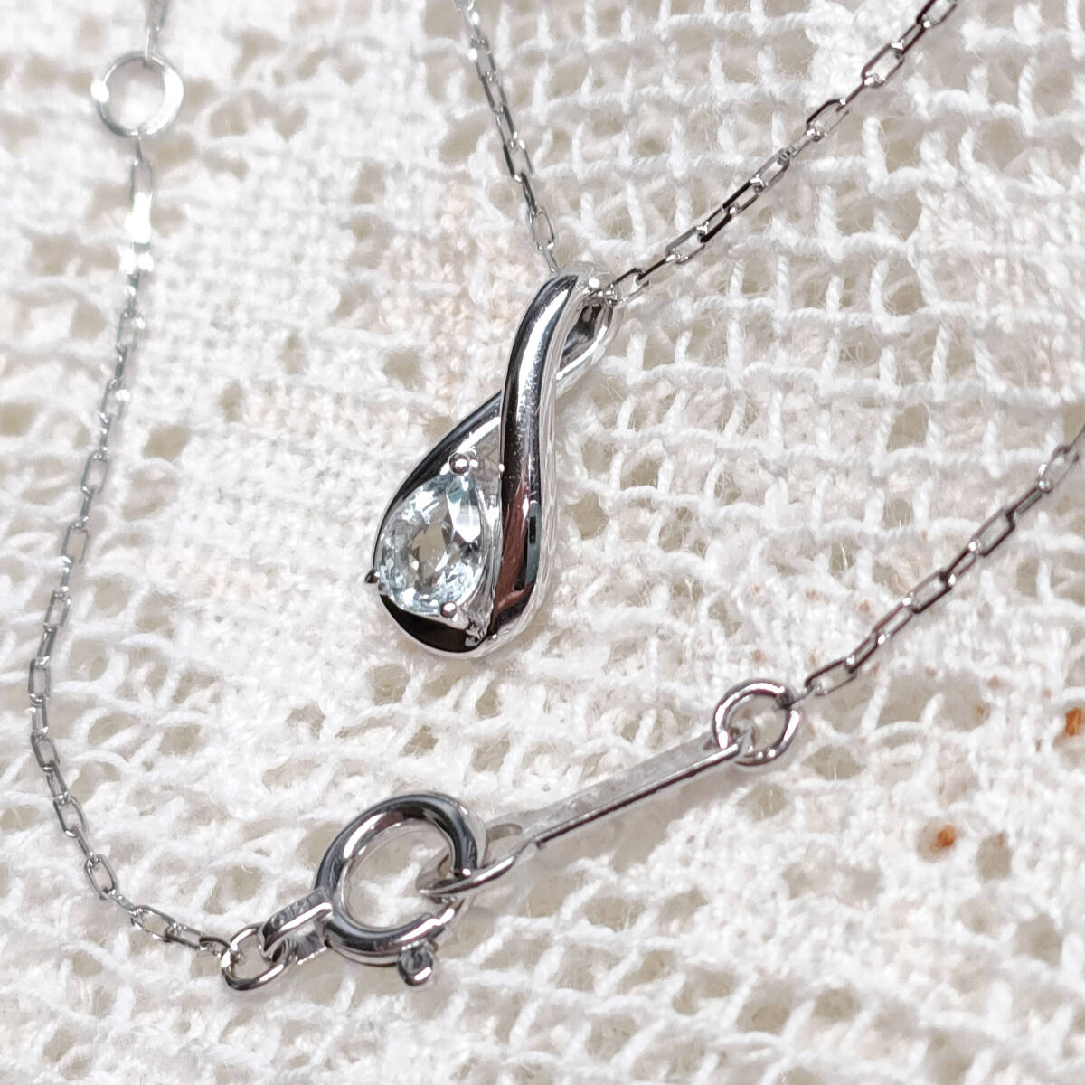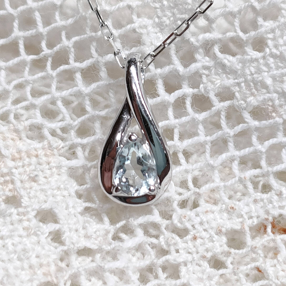 緩やかで立体的なしずくのラインに包まれているようにあしらったアクアマリン。洗練された美しいホワイトゴールド素材と宝石の色味がなんとも美しく、揺れる度にデコルテラインを優しく彩ってくれます。