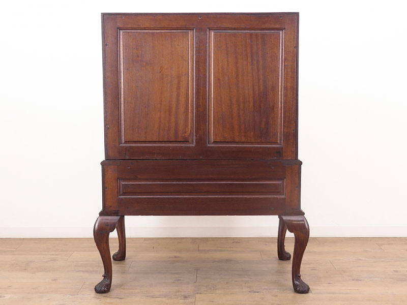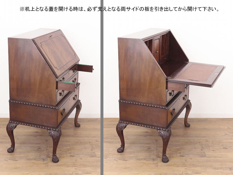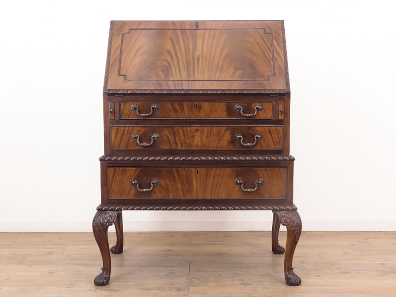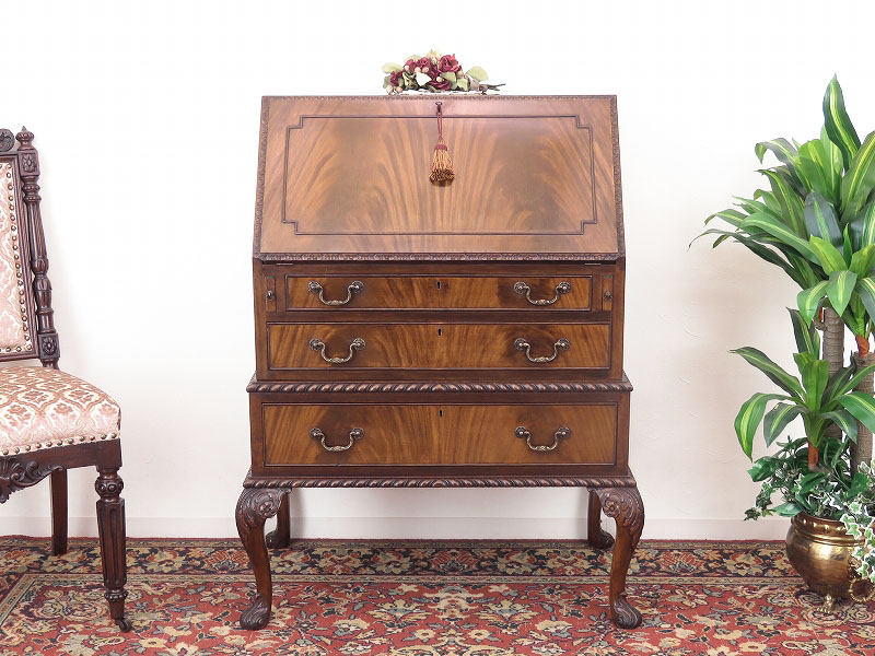 脚に豪華な彫刻が施されたマホガニー材のイギリスのライティングビューローです。2段目の引き出し下から上下に分かれるセパレートタイプで、机上のある上部は下部にはめ込んで載せるようになっています。背板や引き出しの底板などにも無垢板が使われているなど、上質な作りのライティングビューローです。