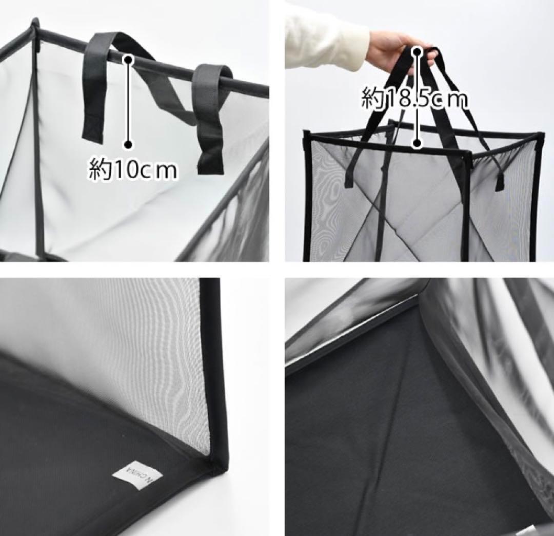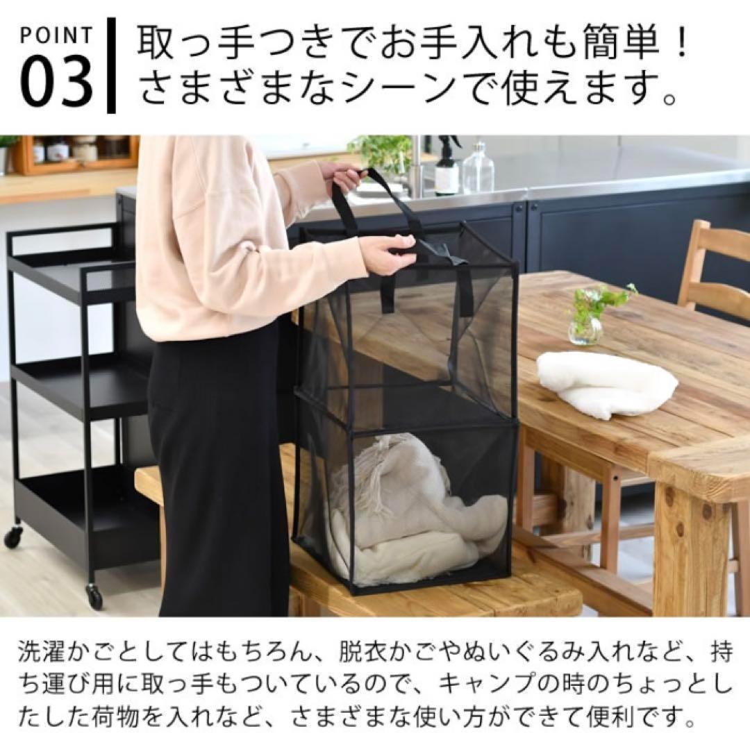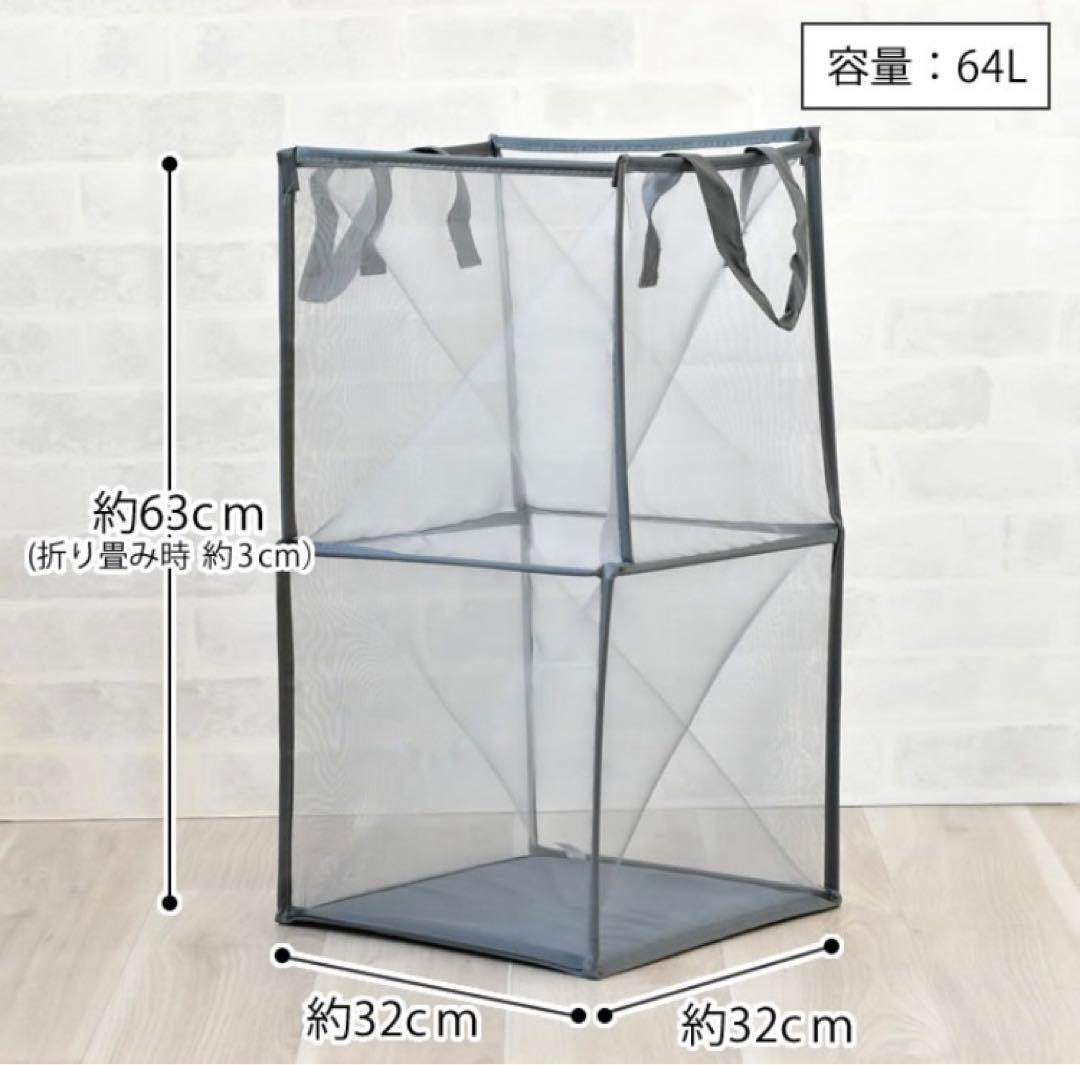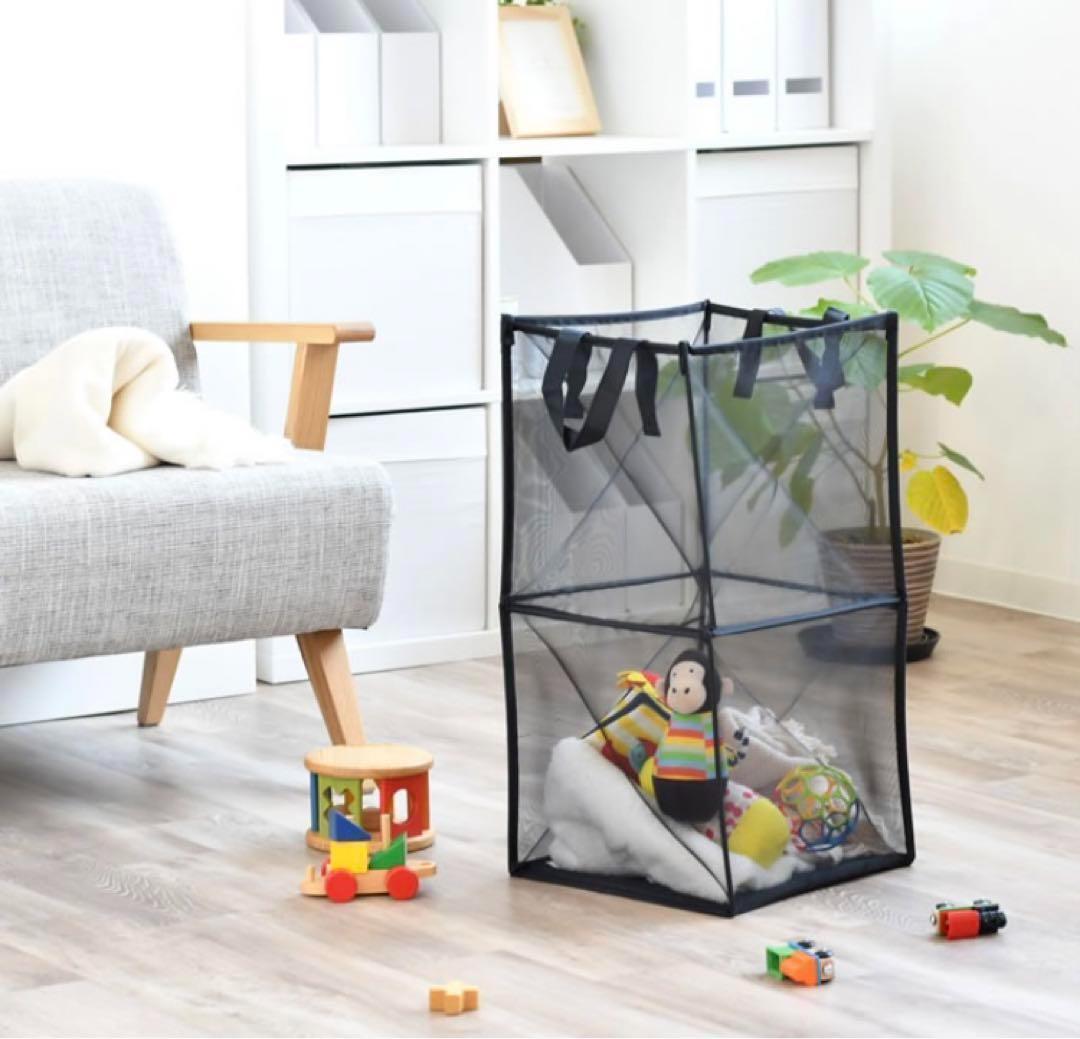 棚や洗濯機の隙間などの省スペース収納が可能で、必要な時だけパッと広げてシーツなどのかさばる洗濯物の一時置きなどに便利。 メッシュ素材で通気性がよいので、洗濯物は蒸れにくく、中身が見えるので、おもちゃの収納にもおすすめです♪