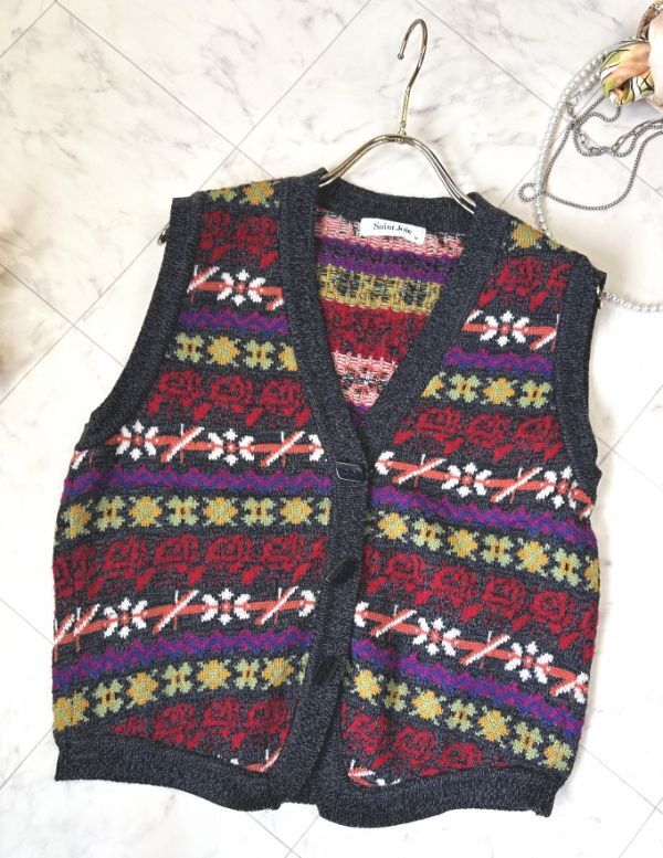 e527★ saint joie 90’S ビンテージ ニット ベスト ジレ 花柄 ノルディック 薔薇 ローズ フェアアイル柄 レディース トップス グレー 商品詳細 ■ブランド名:saint joie ■メーカーサイズ:M ■平置き実寸サイズ(センチ):着丈52.0 身幅50.0 ■素材(%):毛90アクリル5ナイロン5 ■色柄:グレーベース/マルチカラー/フェアアイル柄 ■商品コメント saint joieのレディーストップスでございます(^^) ながらく家にビニールにつつまれて保管していたデッドストック。 フラワー柄やボタンの形などディテールがかわいらしい一着です。 |