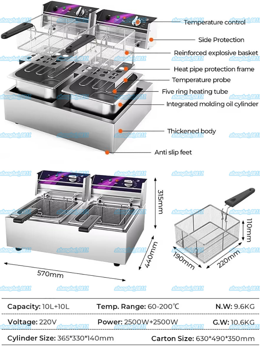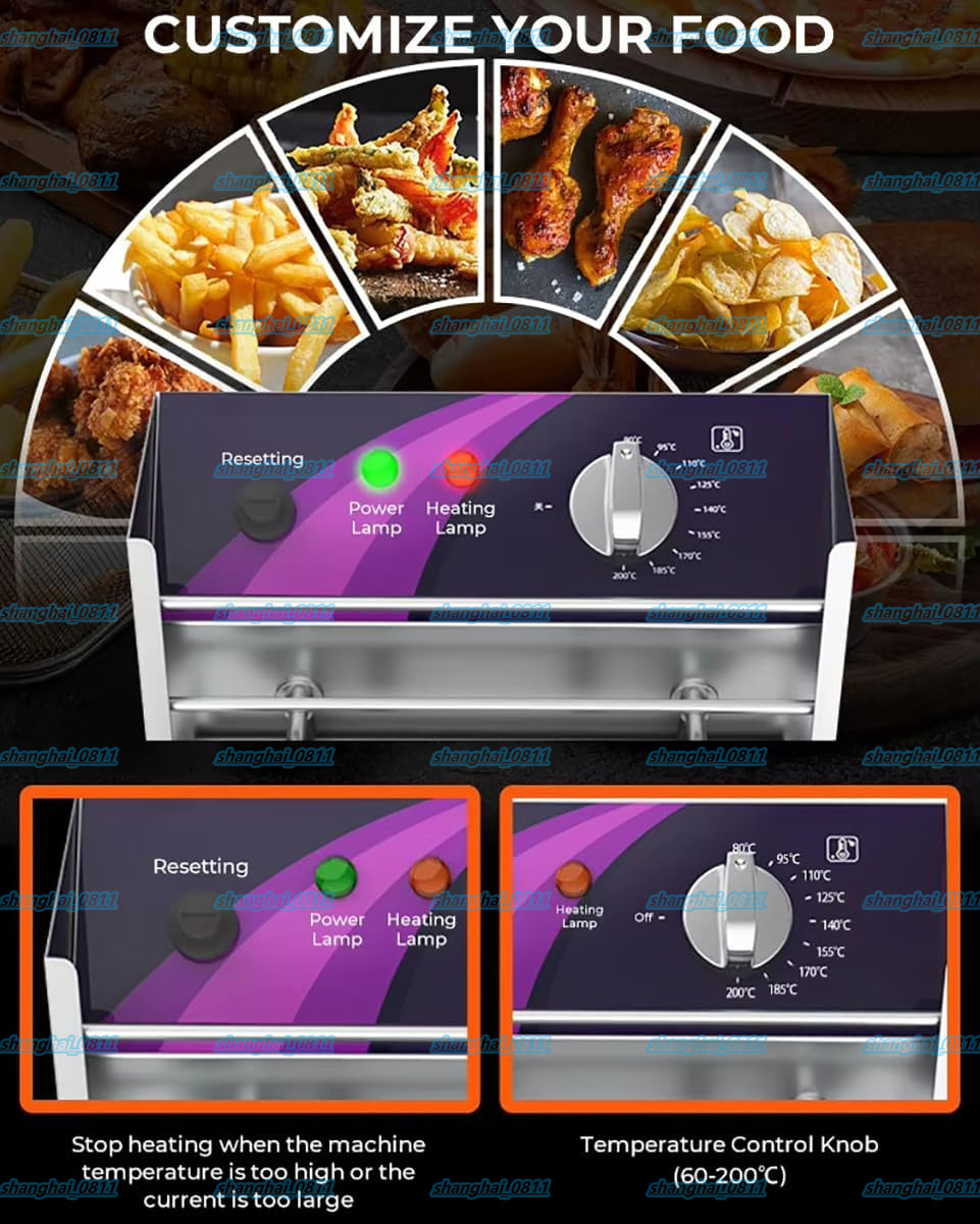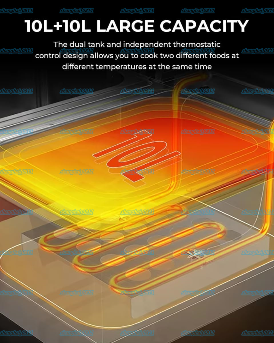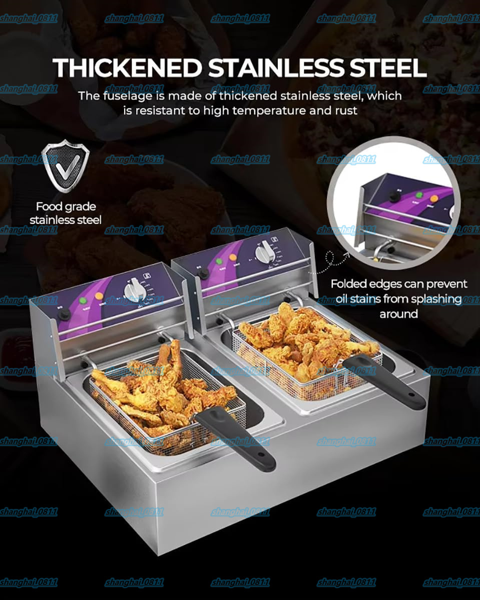 【汎用性と効率性を実現するデュアルタンク設計】: この業務用電気ディープフライヤーは、合計オイル容量が 10L/10L+10L のデュアルタンク設計を採用しており、風味が移ることなく、さまざまな食品を同時に揚げることができます。生産性を高め、さまざまな料理を簡単に調理できます。忙しいレストラン、フードトラック、ケータリングビジネスに最適です。【パワフルで素早い加熱】: 1 つの温度ノブでタンクを個別に制御し、揚げたいものに応じて適切な温度を選択できます。このオイル ディープ フライヤーは、熱を均等に分散する U 字型のステンレス スチール加熱チューブを使用して設計されています。【使いやすく、メンテナンスが簡単】: カウンタートップ ディープ フライヤーは頑丈なステンレス スチール製で、構造がしっかりしています。耐久性のある厚手のタンクは取り外して簡単に掃除できます。【業務用ディープ フライヤー】: このディープ フライヤーは、油の回復が速く、油を専門的に加熱して、油の吸収を最小限に抑えながら、プロフェッショナルで健康的な結果を実現します。常に均一に揚げられ、カリカリでおいしい料理を提供