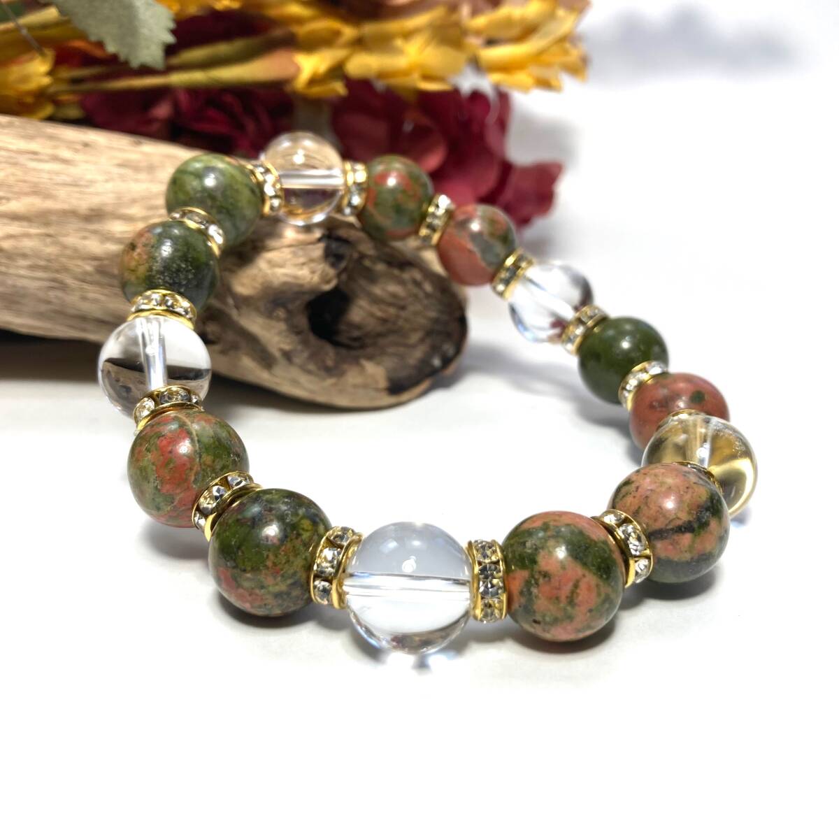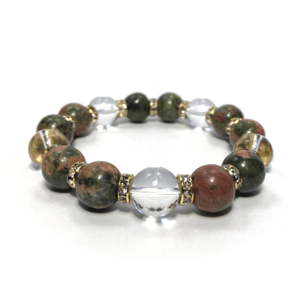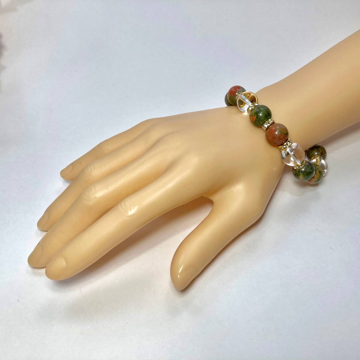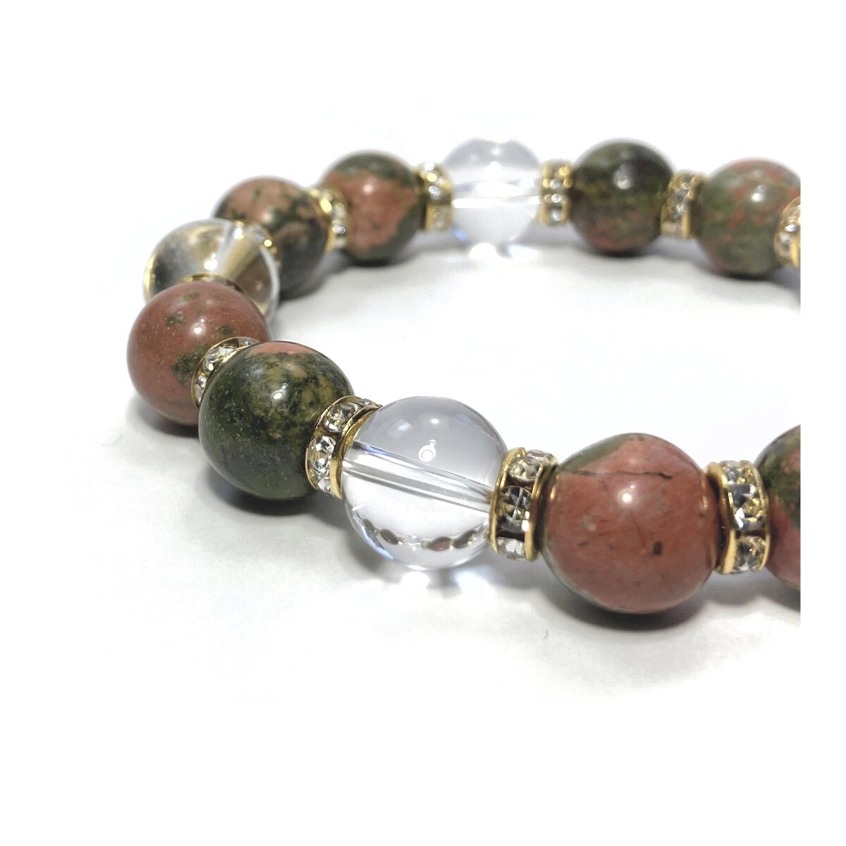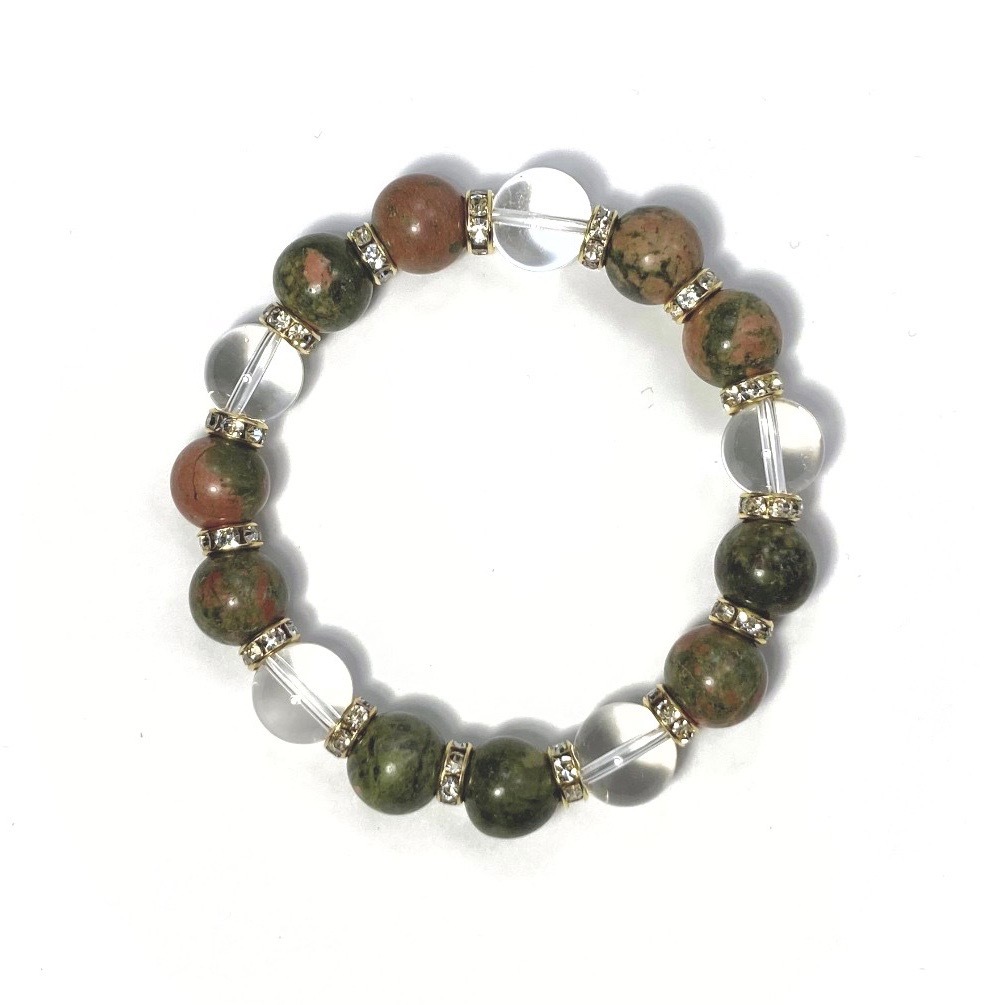こちらは、ユナカイトと水晶を組み合わせたパワーストーンブレスレットです。間にはロンデルを挟み高級感あるデザインに仕上げております。石大きさは12mm玉を使用して内径約18cmです。気になる方は是非この機会にどうぞ。