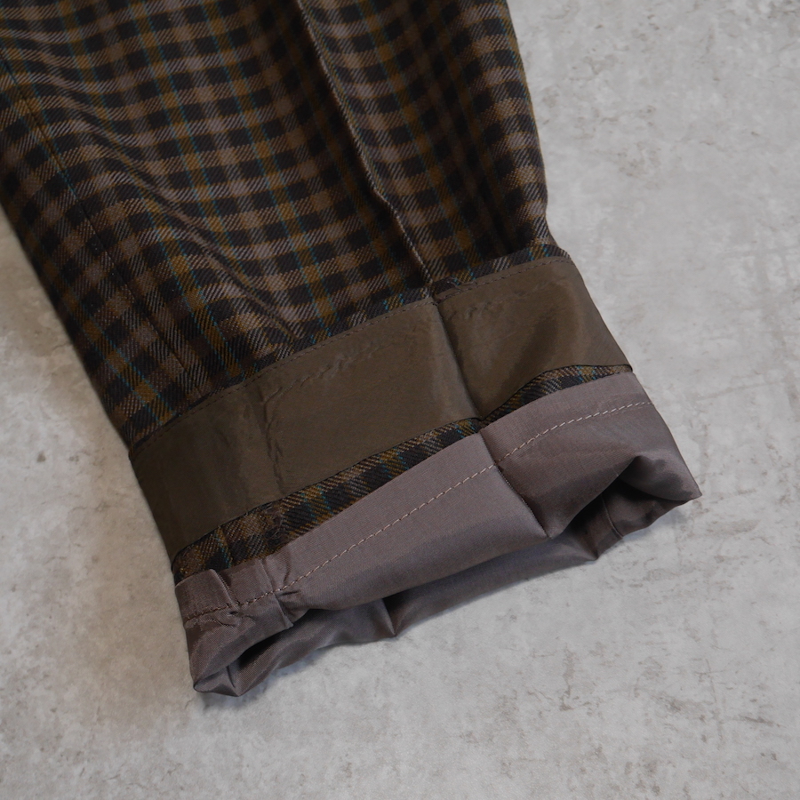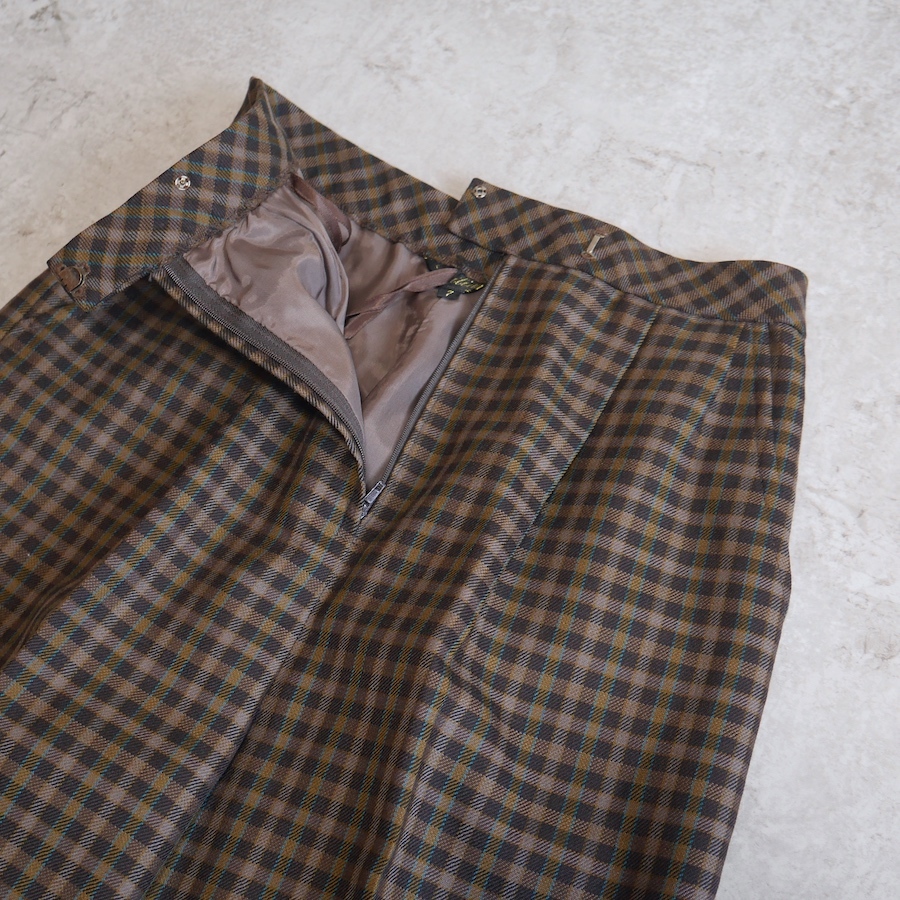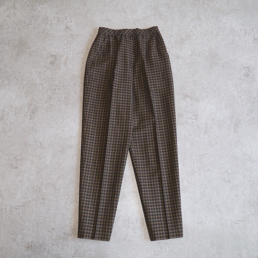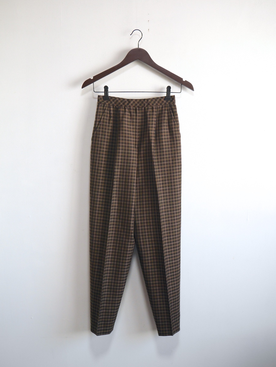 やや強めにテーパードされたハイウエストのチェックパンツ。 股上が深めで安心感のある穿き心地。 ウールですがサラッとした手触りで真夏以外は着用していただける生地です。