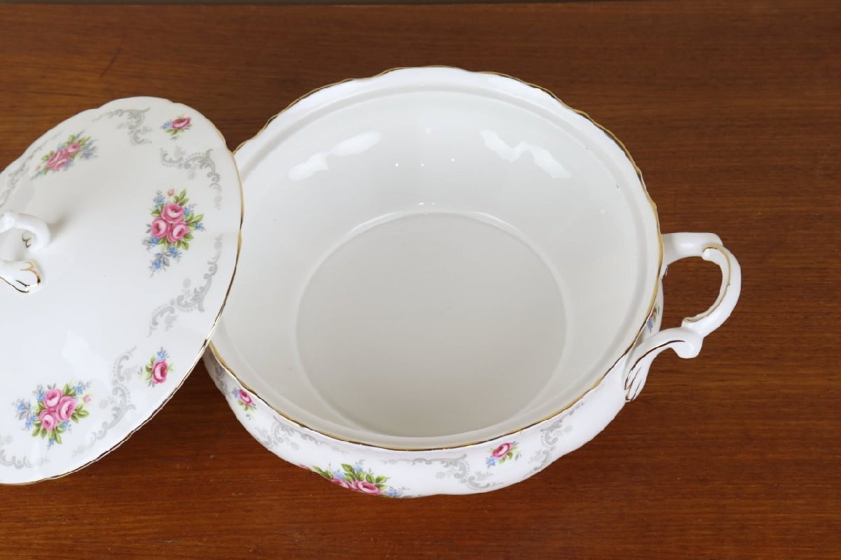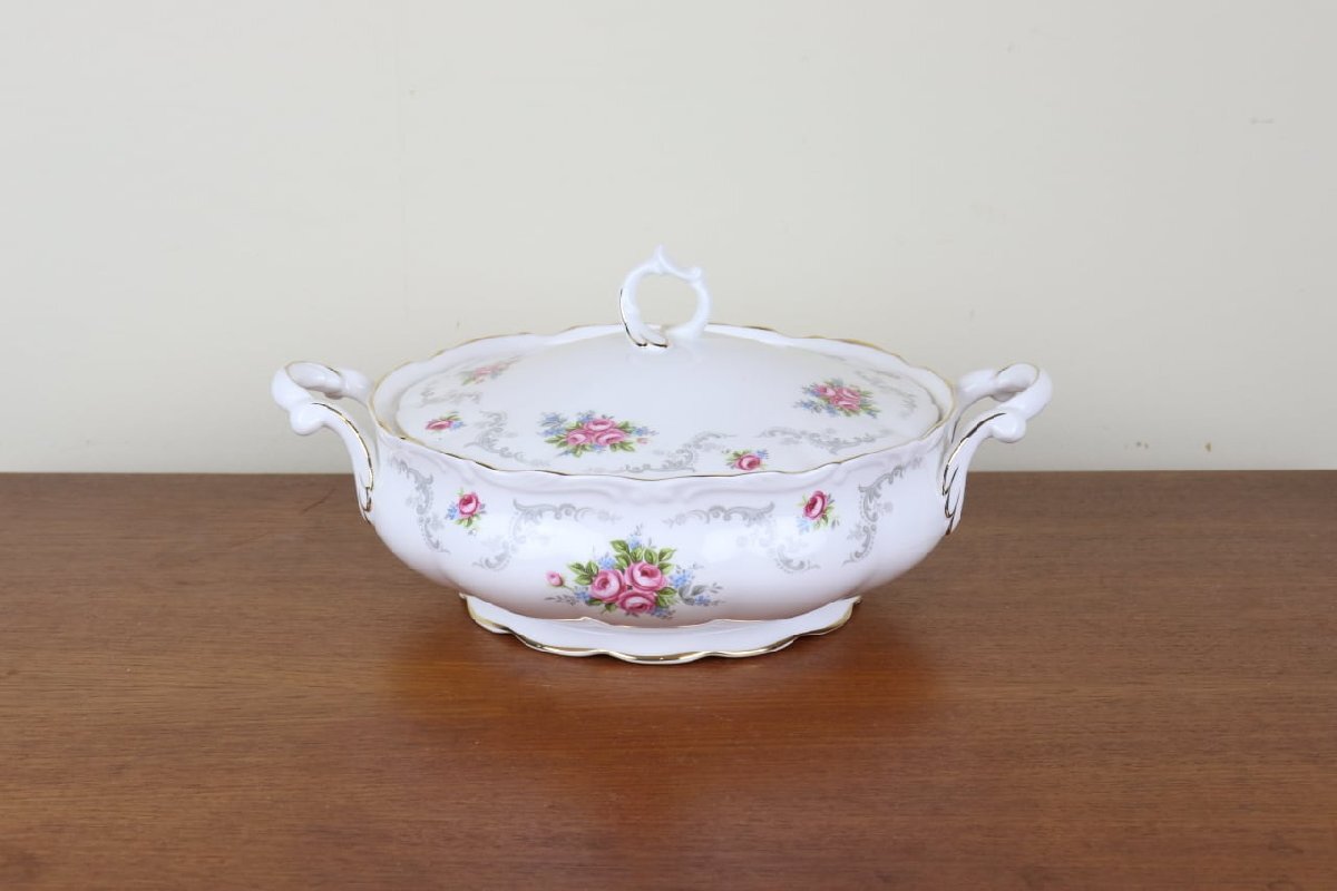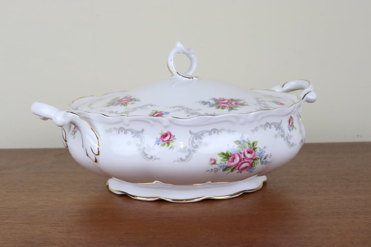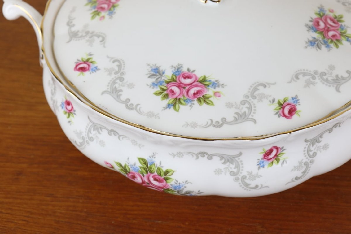 縁にエンボス加工が施され、ピンクとグレーのバラが大変可愛らしいデザインです。