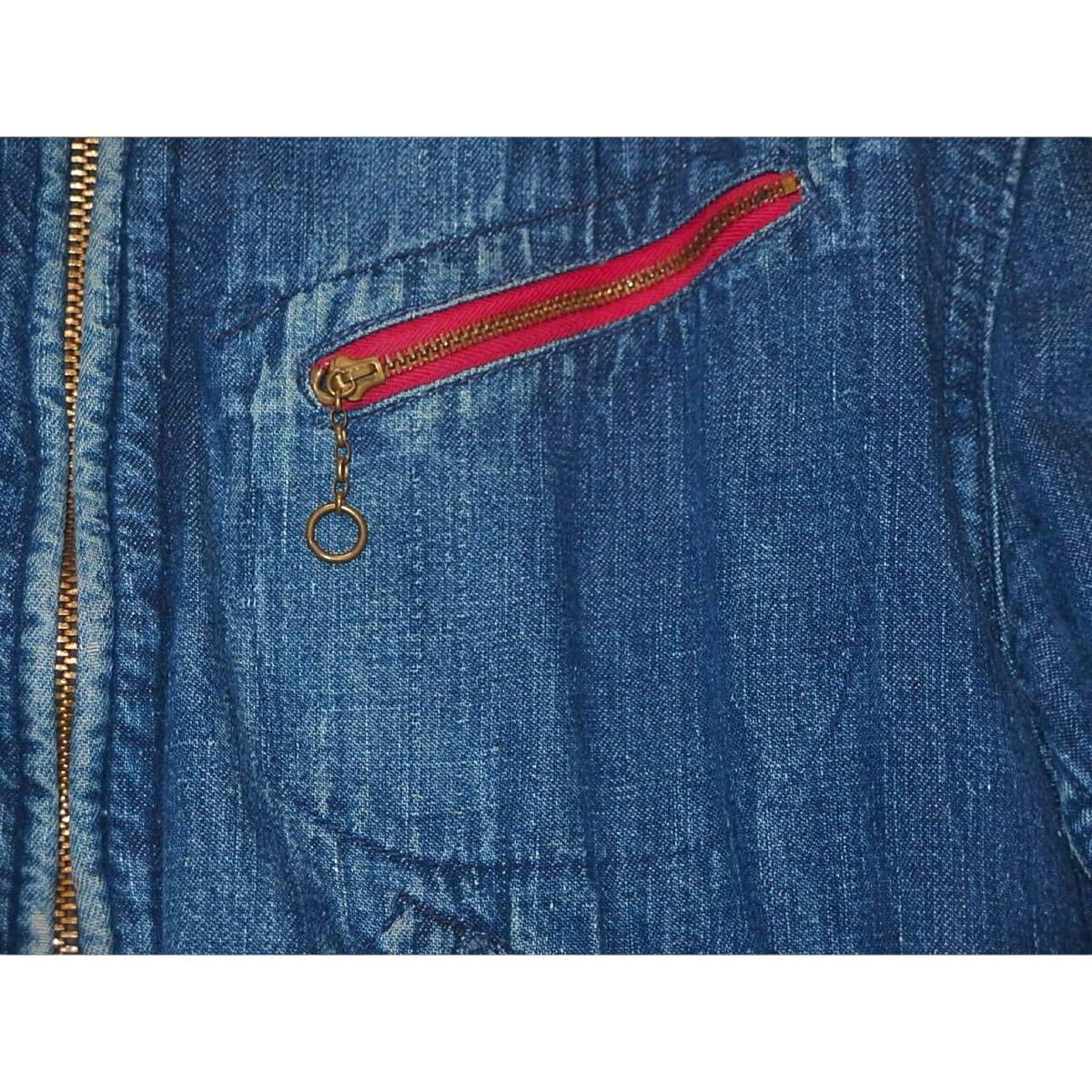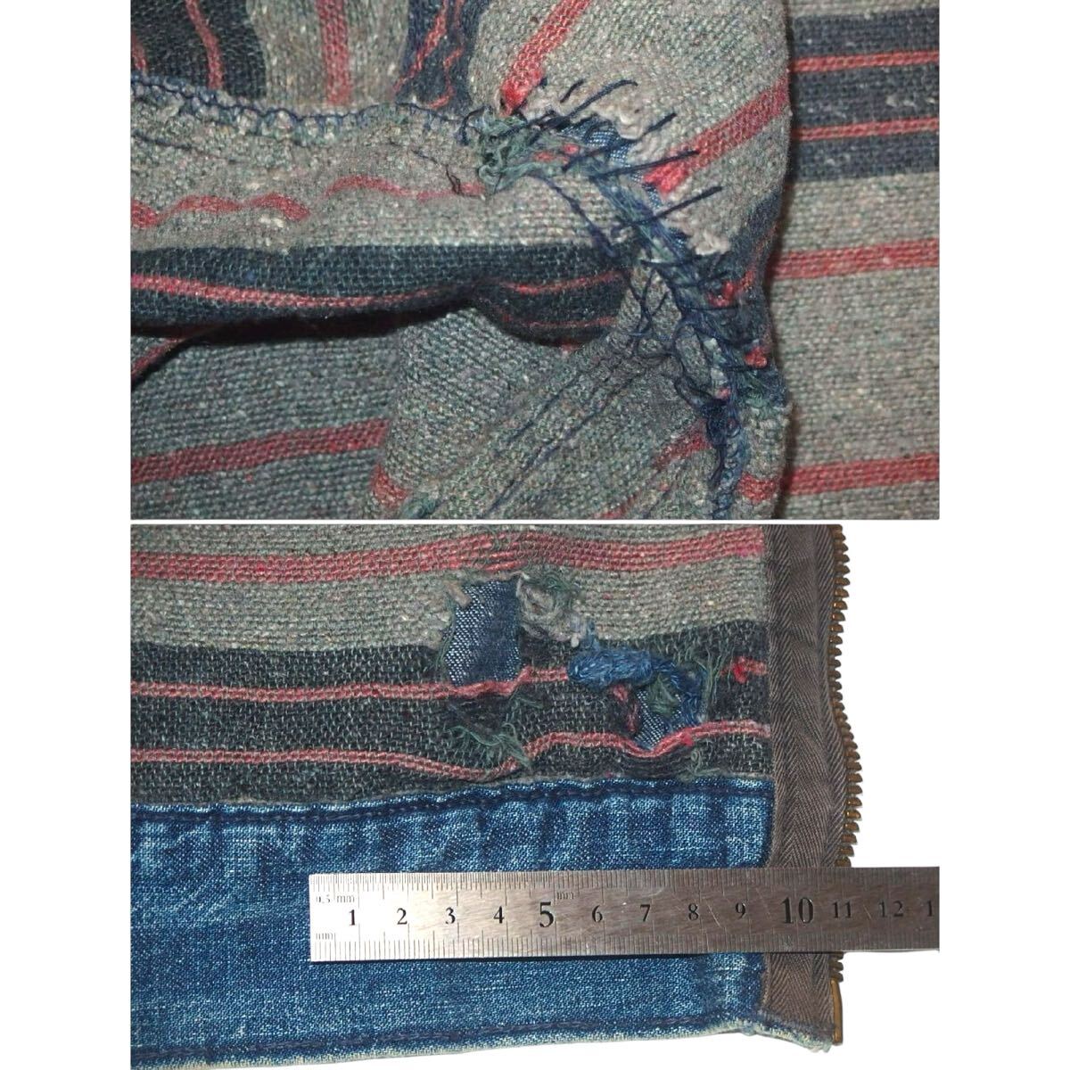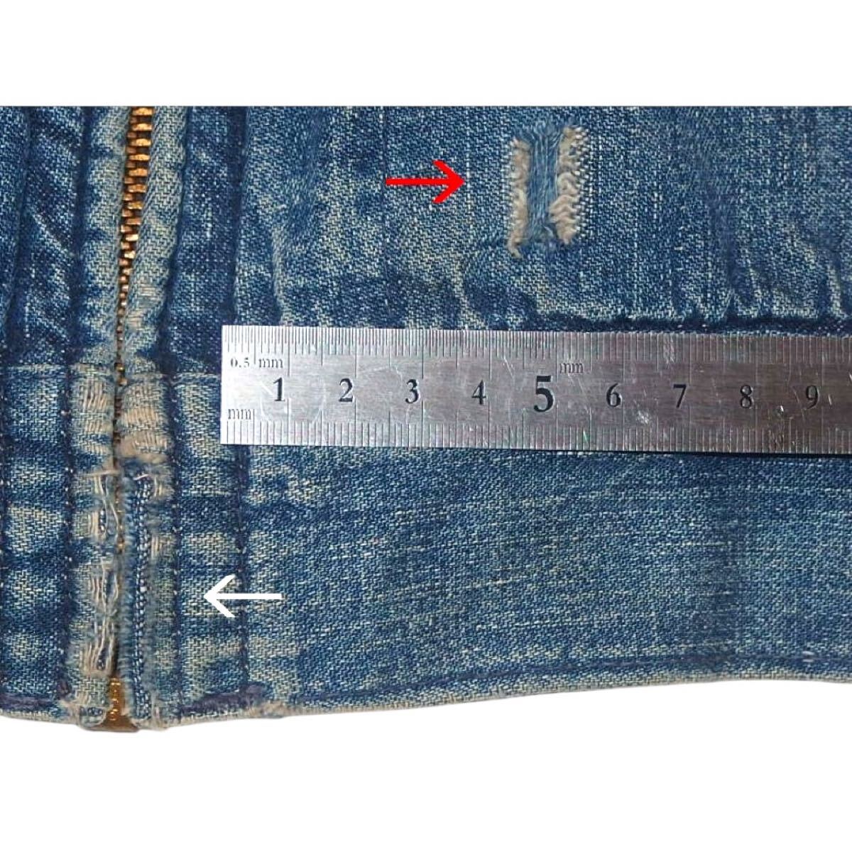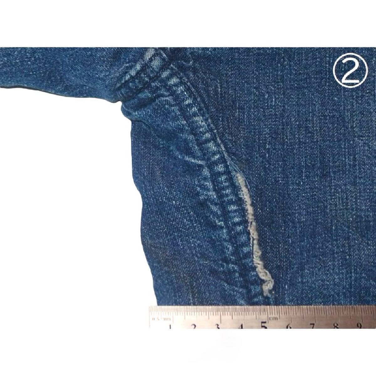 (両袖口にダメージ 画像①:左袖のダメージ ②:背面左袖の脇下 フロント裾に矢印のようなダメージ ライニング裾付近ダメージと右脇に補修)
