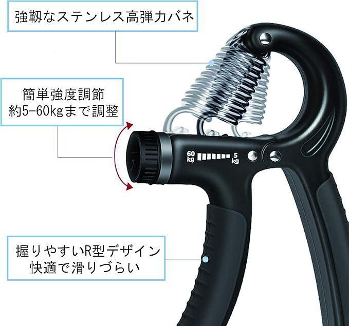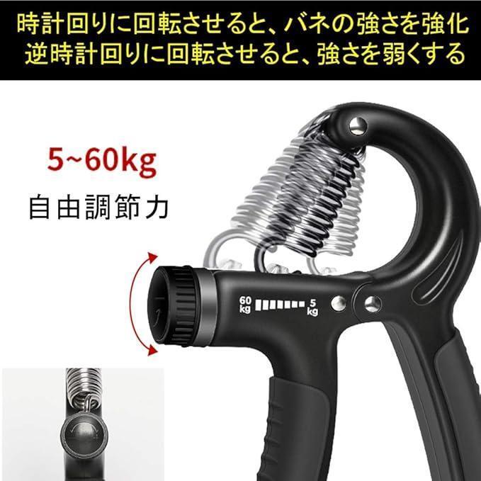 【握力グリップ 負荷調整】、ハンドグリップステンレスばね付き、握力計の負荷の強さ(約5-60kg)を調整できます。10kg 20kg 30kg 40kg 50kg 60kg。調整ハンドグリップダイヤルを時計方向に回すと握力負荷が軽くなり、ハンドグリップバネが弱くなる。調整握力 計ダイヤルを逆時計に回すと握力負荷が重くなります。