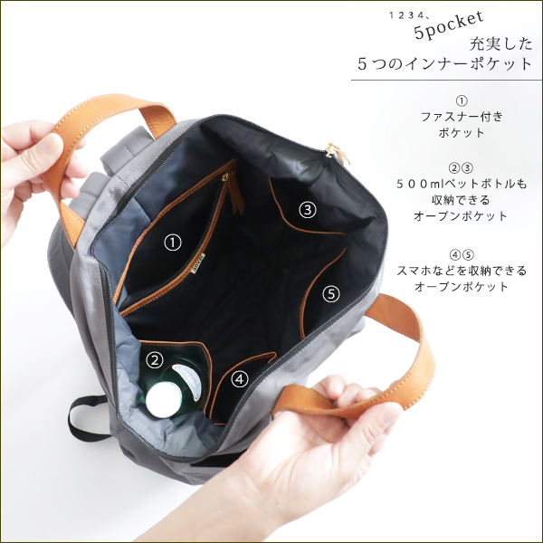 タンブラーやペットボトルの入る【縦長ポケット】や、