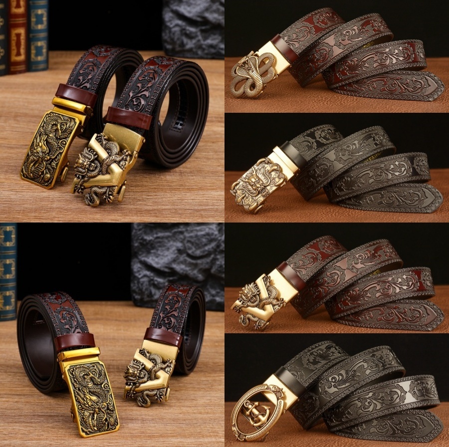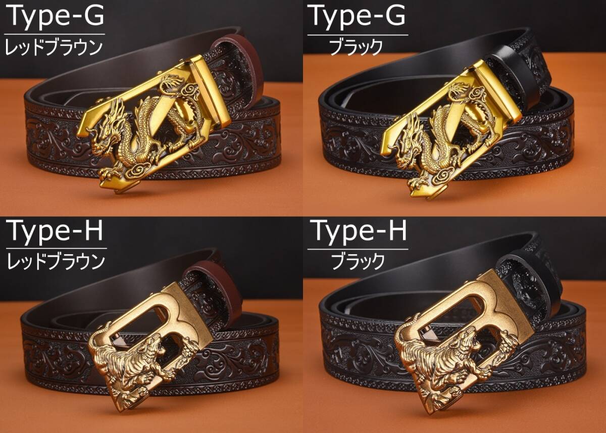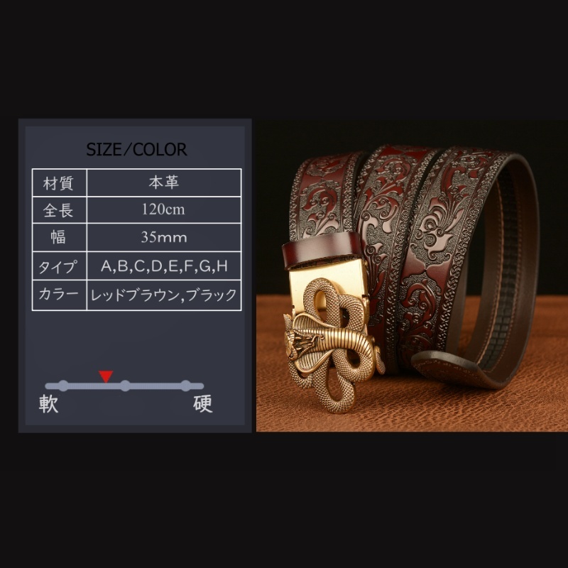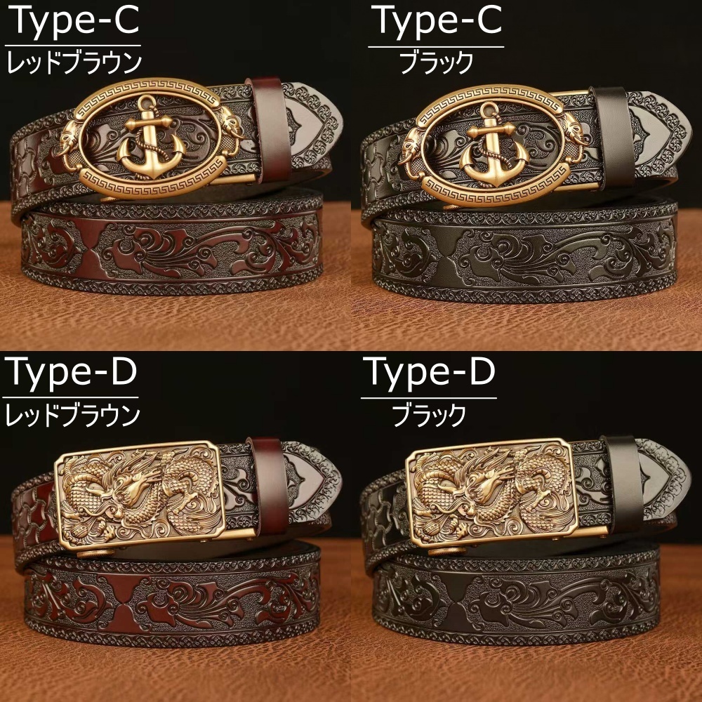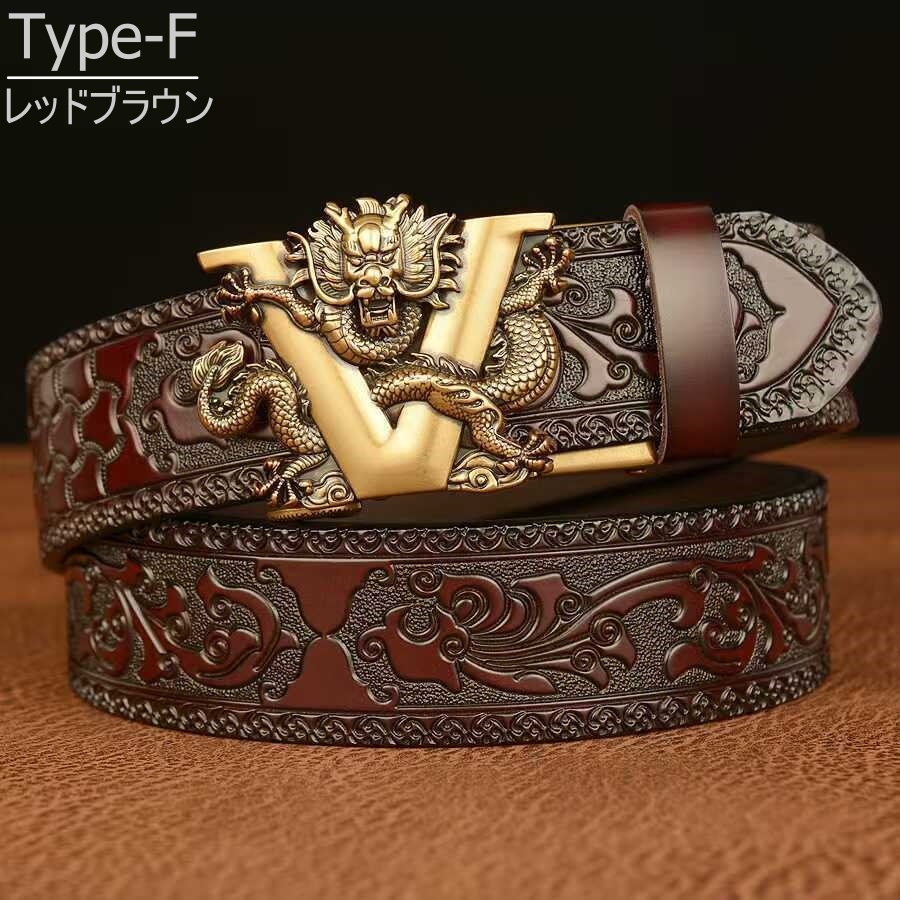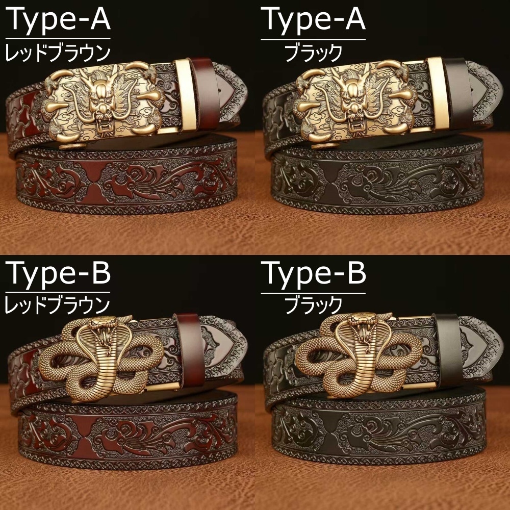 メンズ ベルト オートロックベルト 本革 穴無しベルト 自動ロックベルト オートロック式ベルト ヴィンテージ 龍TypeFレッドブラウン