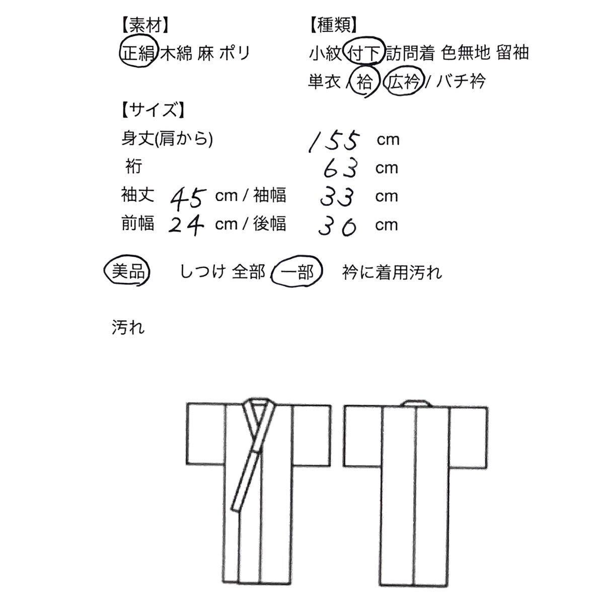【A】【S】新品または未使用品。 【A】中古品ですが、状態が良く、とても美品。 【B】多少の汚れはある。中古品としては状態がよく着用可能。 【C】汚れやシミがある並品で、着用可能かの判断は個人差がある。 【D】汚れやダメージが目立ち、着用はできない。リメイク用の品。 【E】アンティーク ※状態は様々です。 コメント欄やお写真で詳細をお確かめ下さい。 ランクの判断基準は当社の査定によるものです。 見落としがある場合もありますし、個人の見解も様々ですので、ご不安な点は必ずご入札前にご質問下さい。 写真に映らないような小さいシミは、写真や記載にもない場合があります。 |