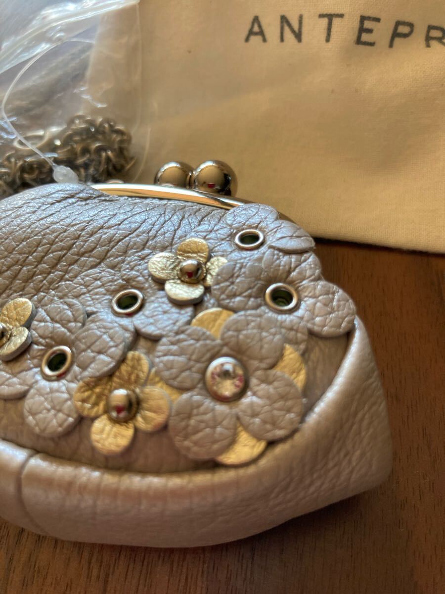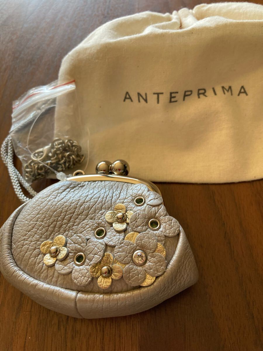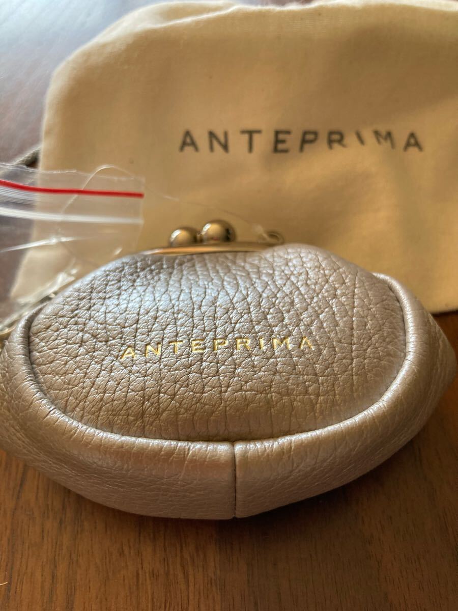 アンテプリマのコインケース、新品保存袋付きです。カラーはグレージュ、サイズはW: 8.5cm H: 7.5cm D: 4cm、素材は牛革です。チェーンストラップ付きです。
