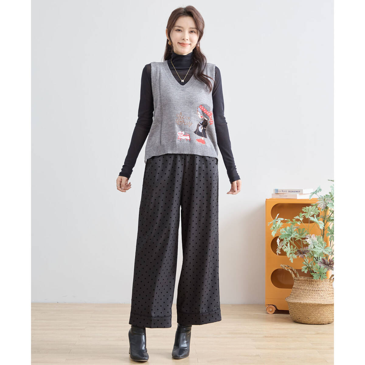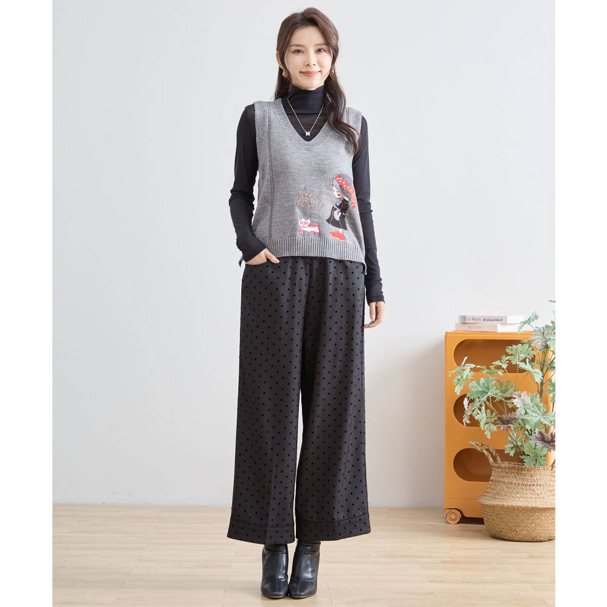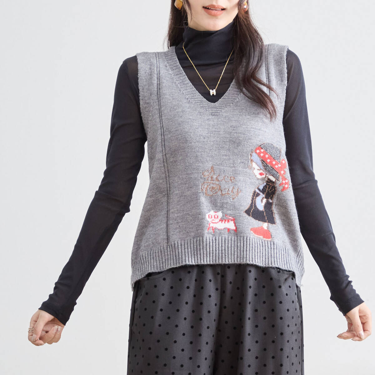 かわいらしい女の子の刺繍が施されたニットベストは、コーディネートに遊び心を加えます。