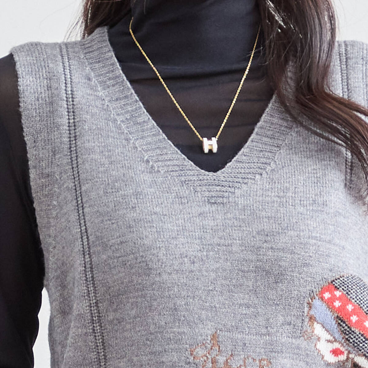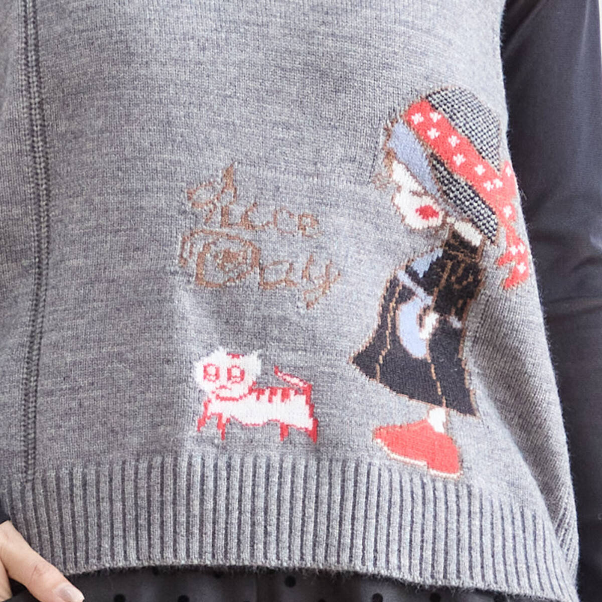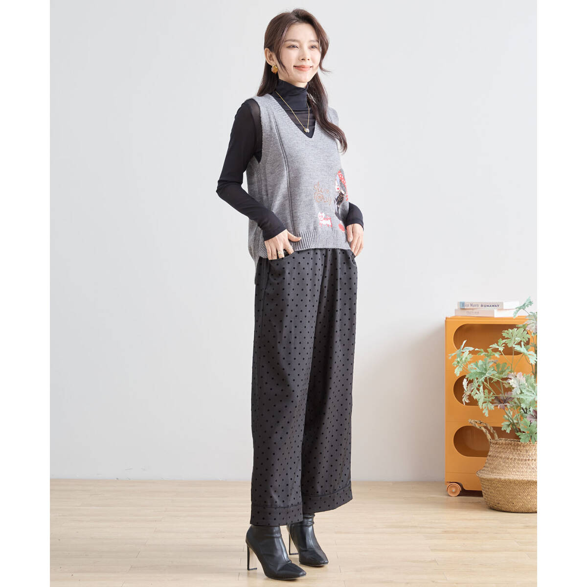 かわいらしい女の子の刺繍が施されたニットベストは、コーディネートに遊び心を加えます。