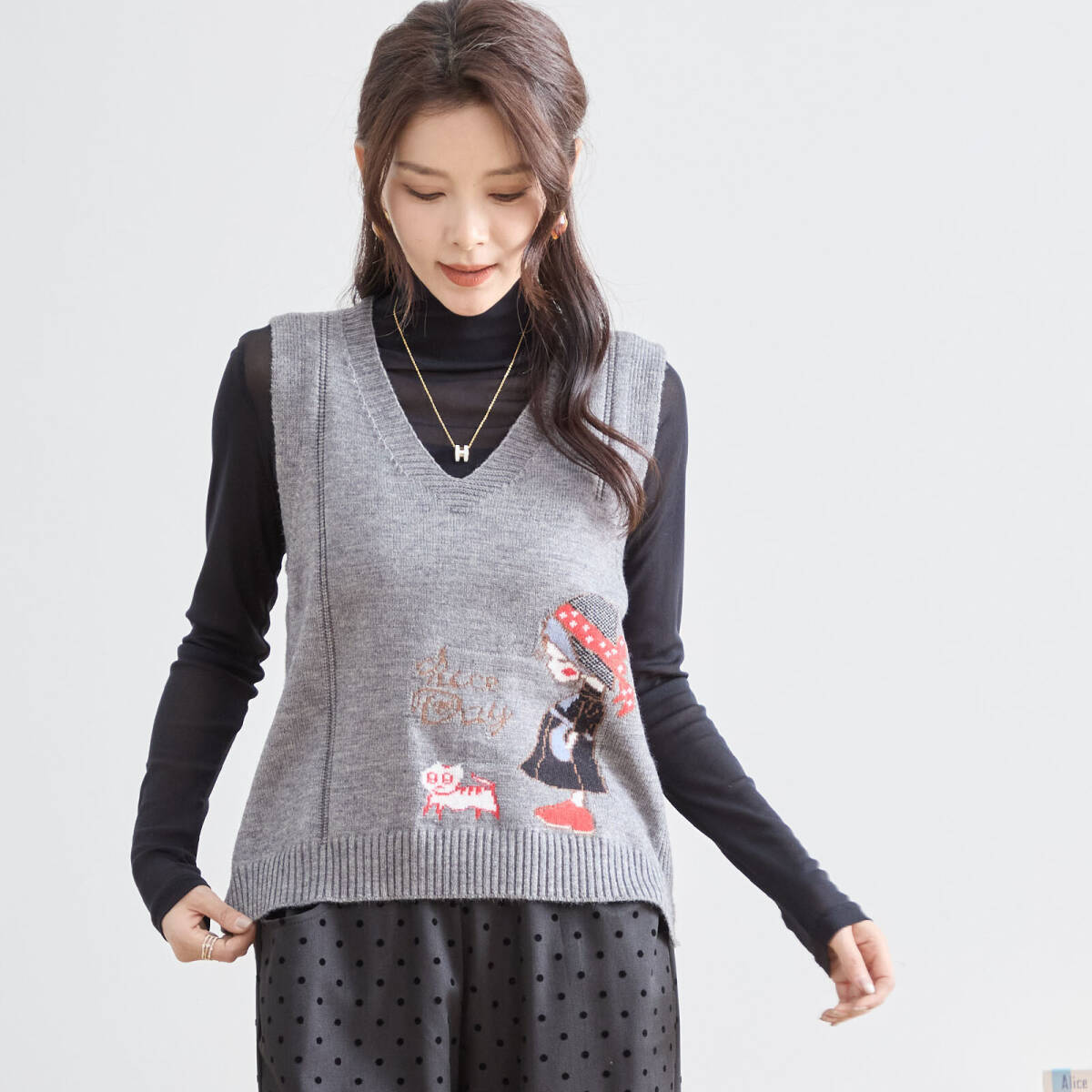 新品☆M〜L レトロガール ニット ベスト 女の子 Vネック レディース かわいい オシャレ 40代 50代 60代 コーデ/グレー/12768188-172