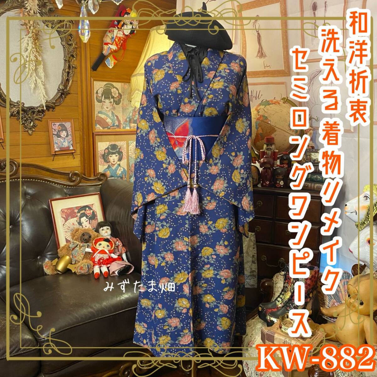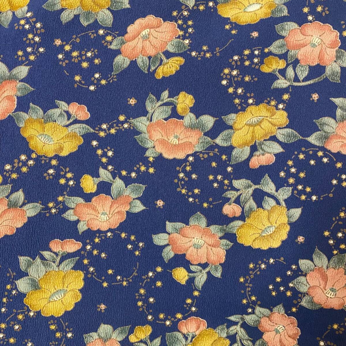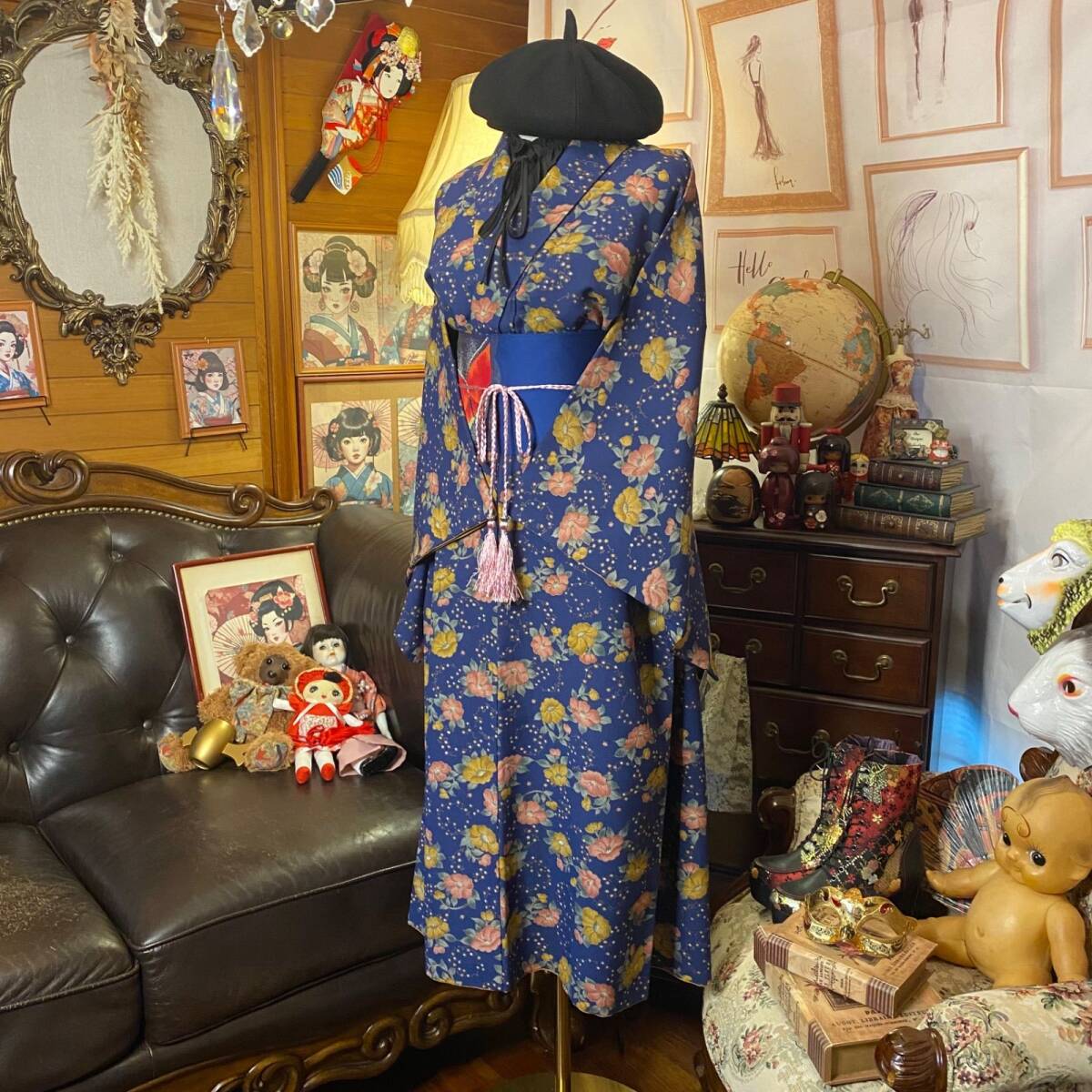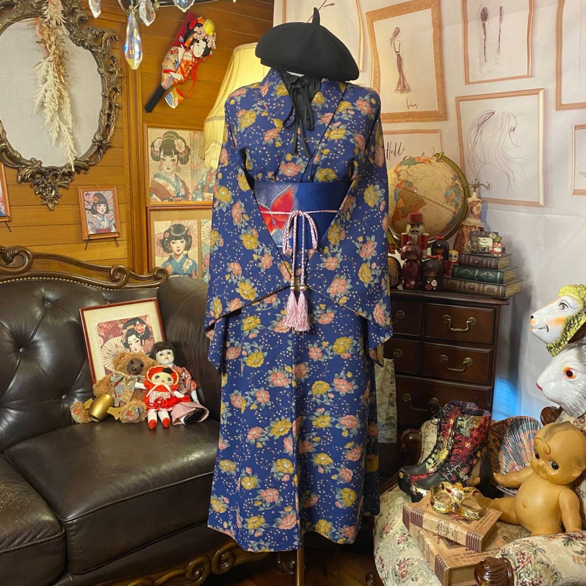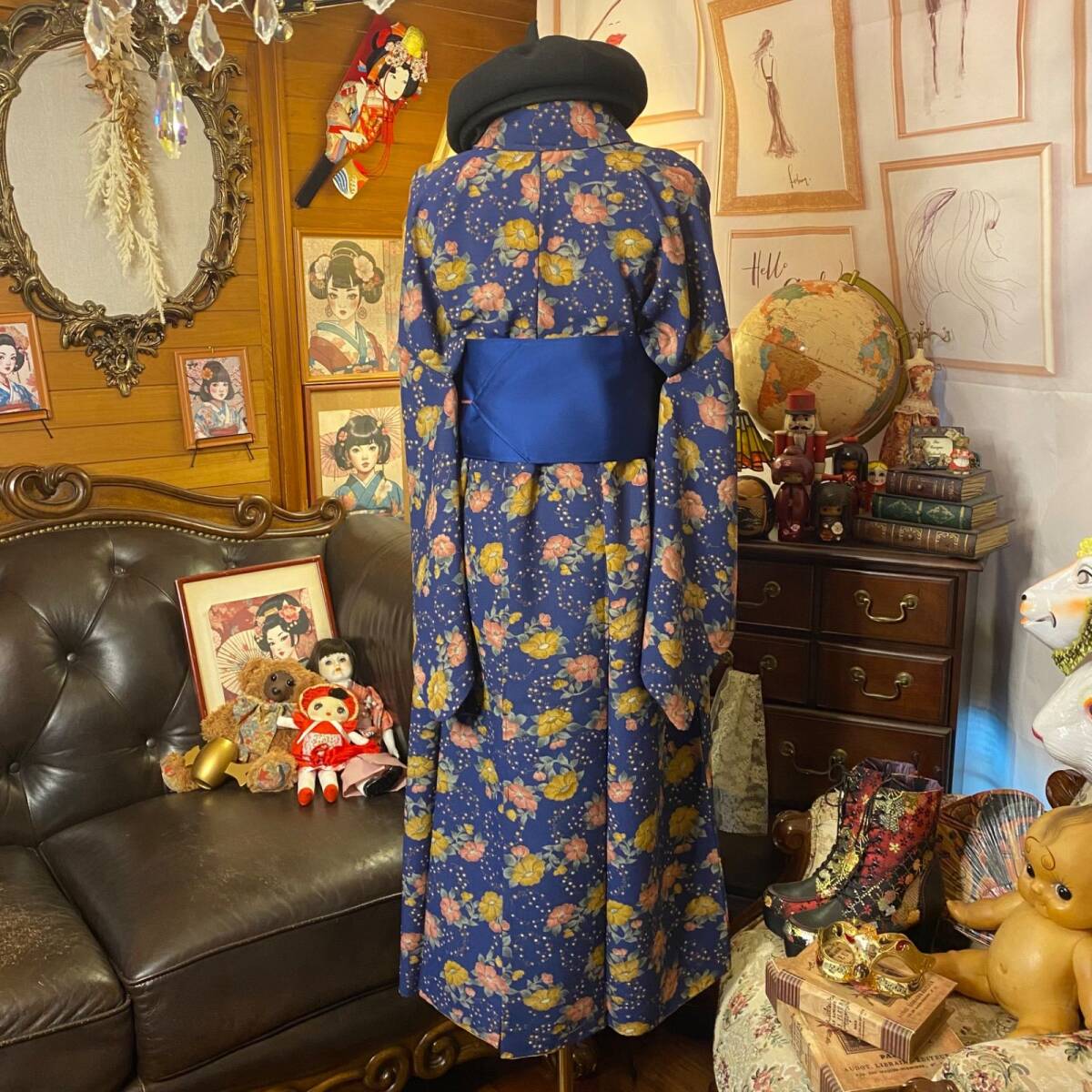 【着物 リメイク セミロング ワンピース ドレス 洗える 化繊 名古屋帯サッシュベルト 和洋折衷 レトロ 古着 ハンドメイド 深みのある藍色に咲き誇る、やわらかな橙色と黄金色の椿の花々。 KW-882】