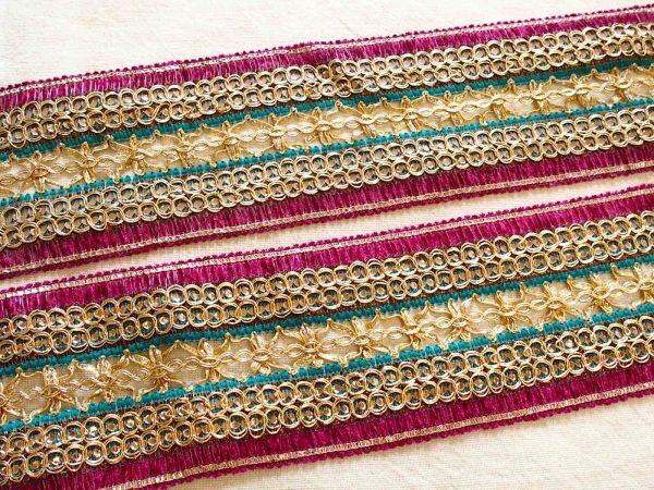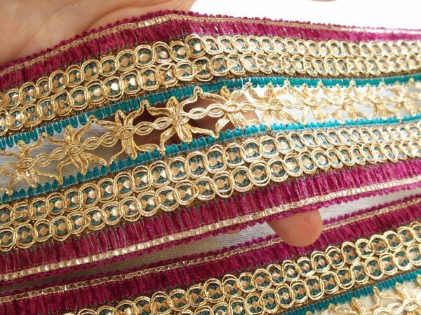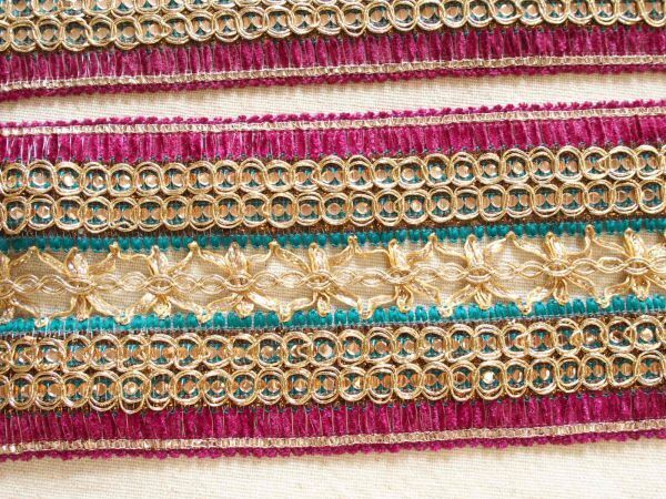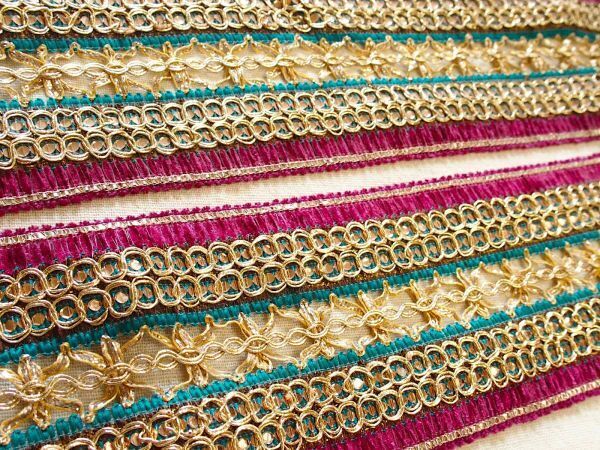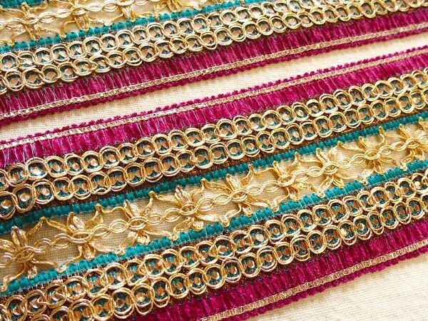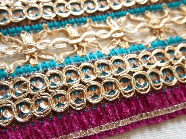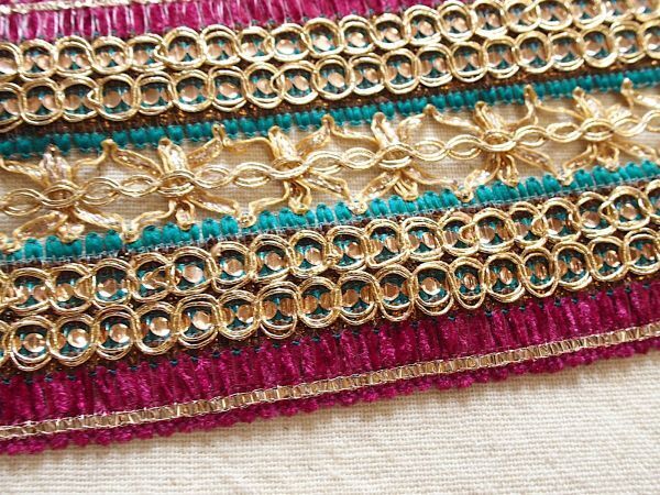 エンジと緑と金色のモールやスパンコール、コードなど様々な素材で