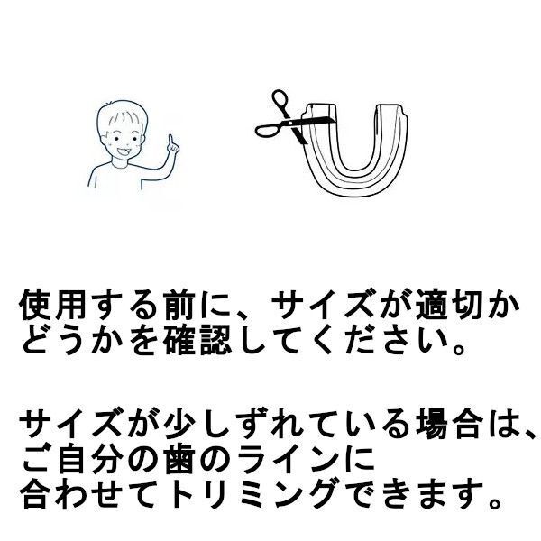 ※使用する前に、サイズが適切かどうかを確認してください。 サイズが少しずれている場合は、ご自分の歯のラインに合わせてトリミングできます。
