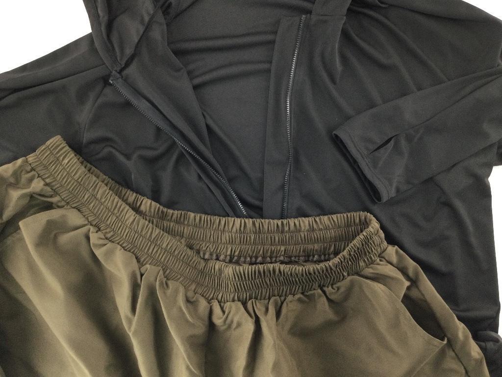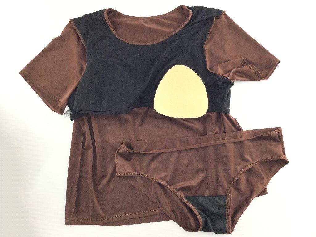 セットには、日差しをガードするラッシュガードと、パンツが付いた半袖タンキニ水着が含まれており、プールや海だけでなく、街着としても使える水陸両用のアイテムです。