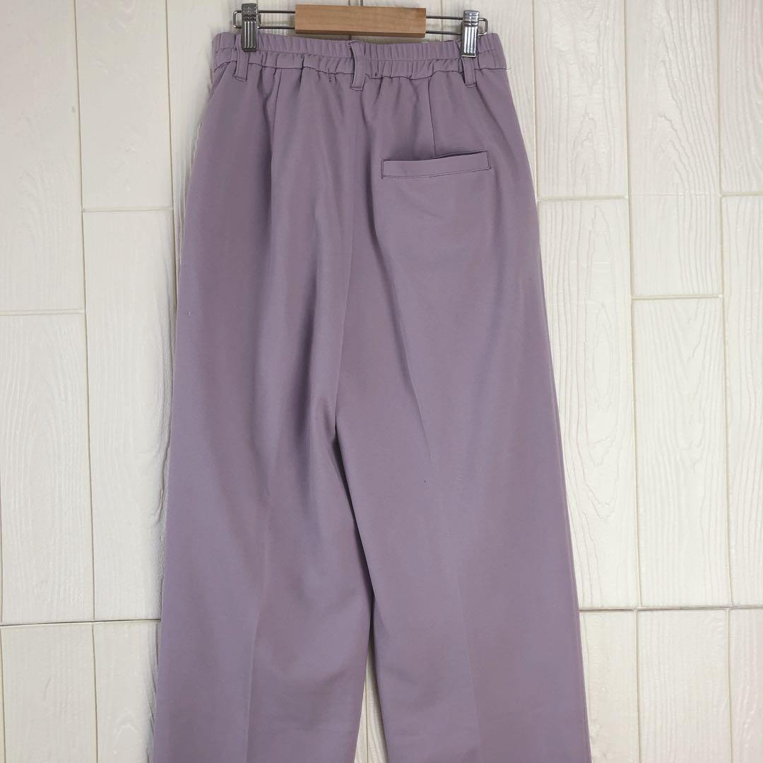ラベンダーカラーのスラックス、ウエスト63cm、股下31cm。