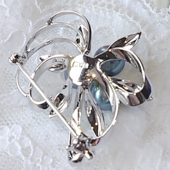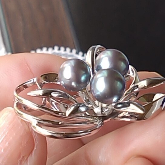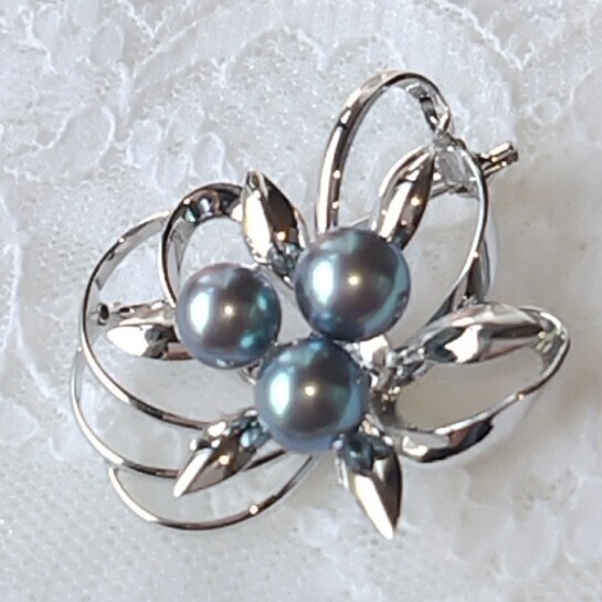 本場伊勢志摩産の希少なグレーパールが3珠あしらわれたブローチです。