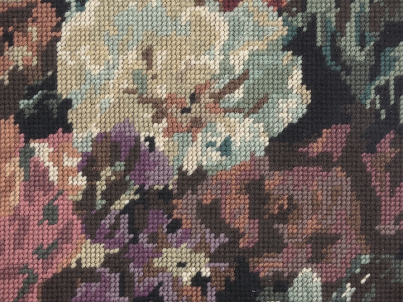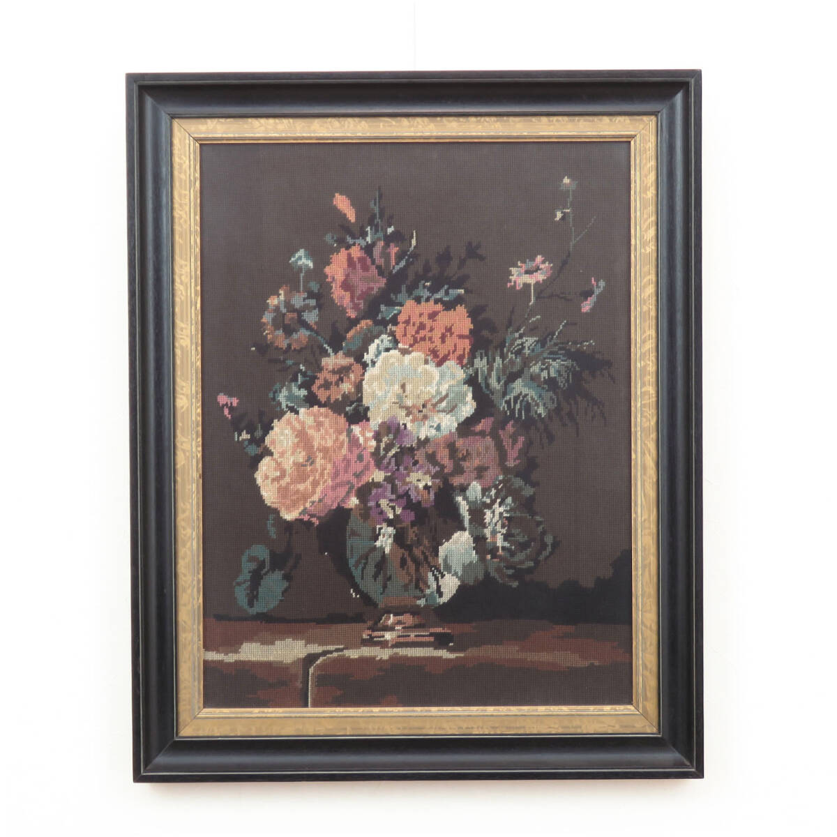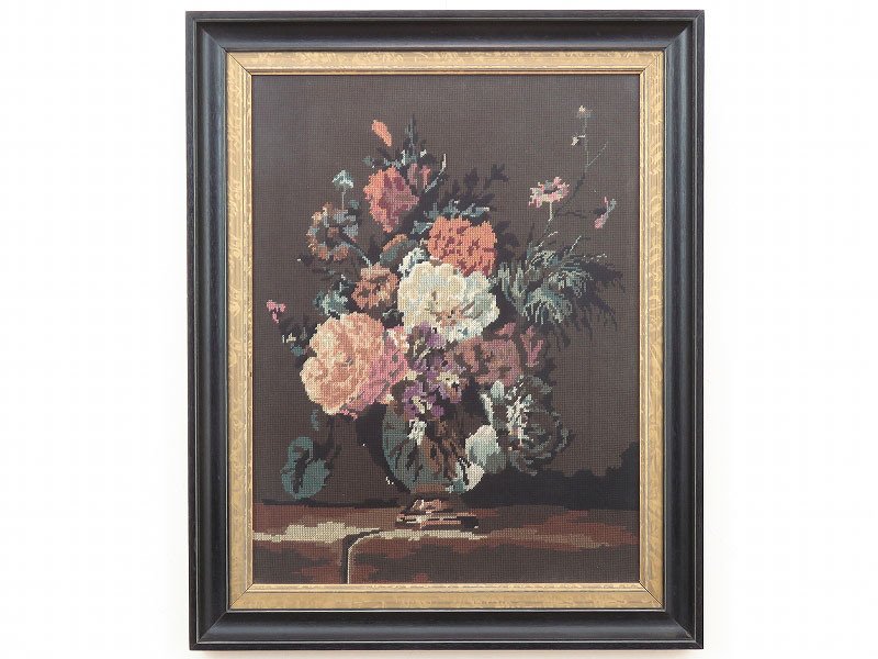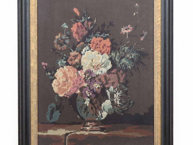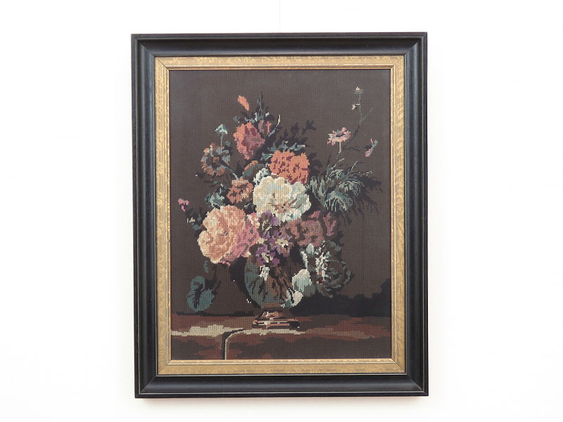 フランスで買い付けたニードルポイント刺繍の古い額です。新品ではありません。花瓶に生けられた豪華な花の刺繍は、深みのある落ち着いた雰囲気の色合いに作られています。