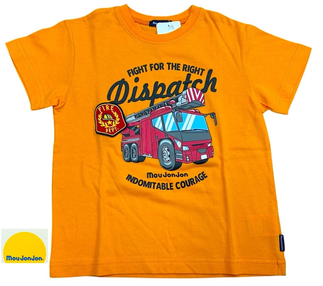 即決 新品タグ付 Moujonjon ムージョンジョン★働く車シリーズ 消防車プリント ワッペン★天竺 半袖Tシャツ★子供 120cm 7-8才 ¥1980