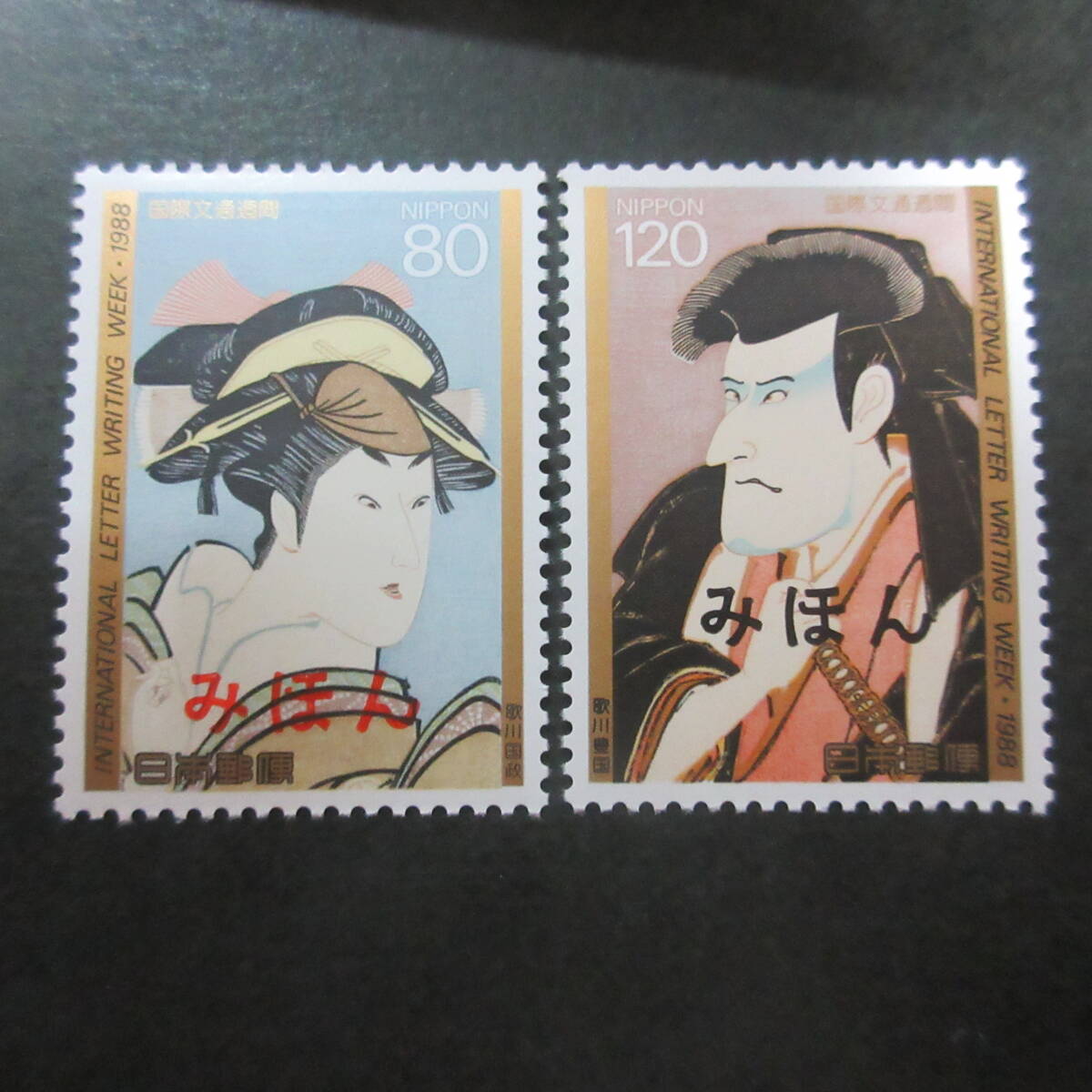 【みほん字入り】昭和63年 国際文通週間「千代/佐々木巌流」(2種完)