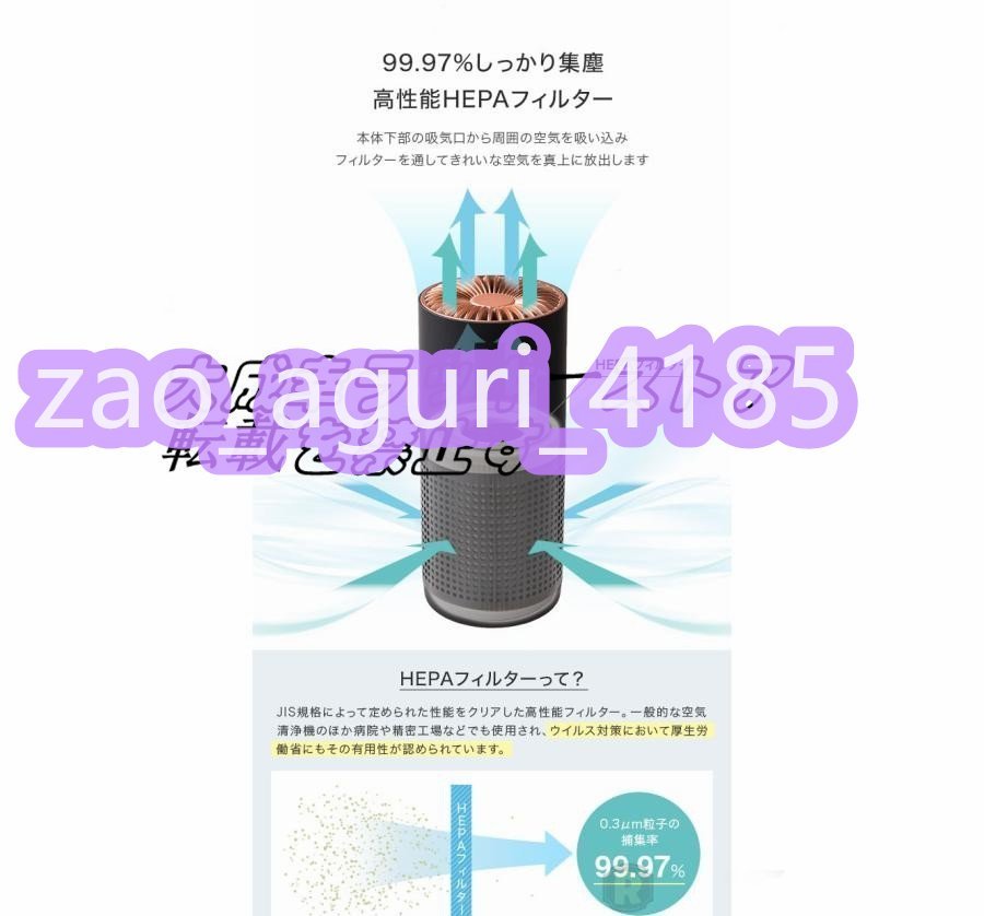 本空気清浄機は高効能フィルターを採用。大きな粒子(毛やホコリなど)を捕集しHPAEフィルターは99.97%の0.3μm以上の微粒子を濾過し活性炭フィルターは各種の臭いと有害なガスを除去。対応畳数:10畳