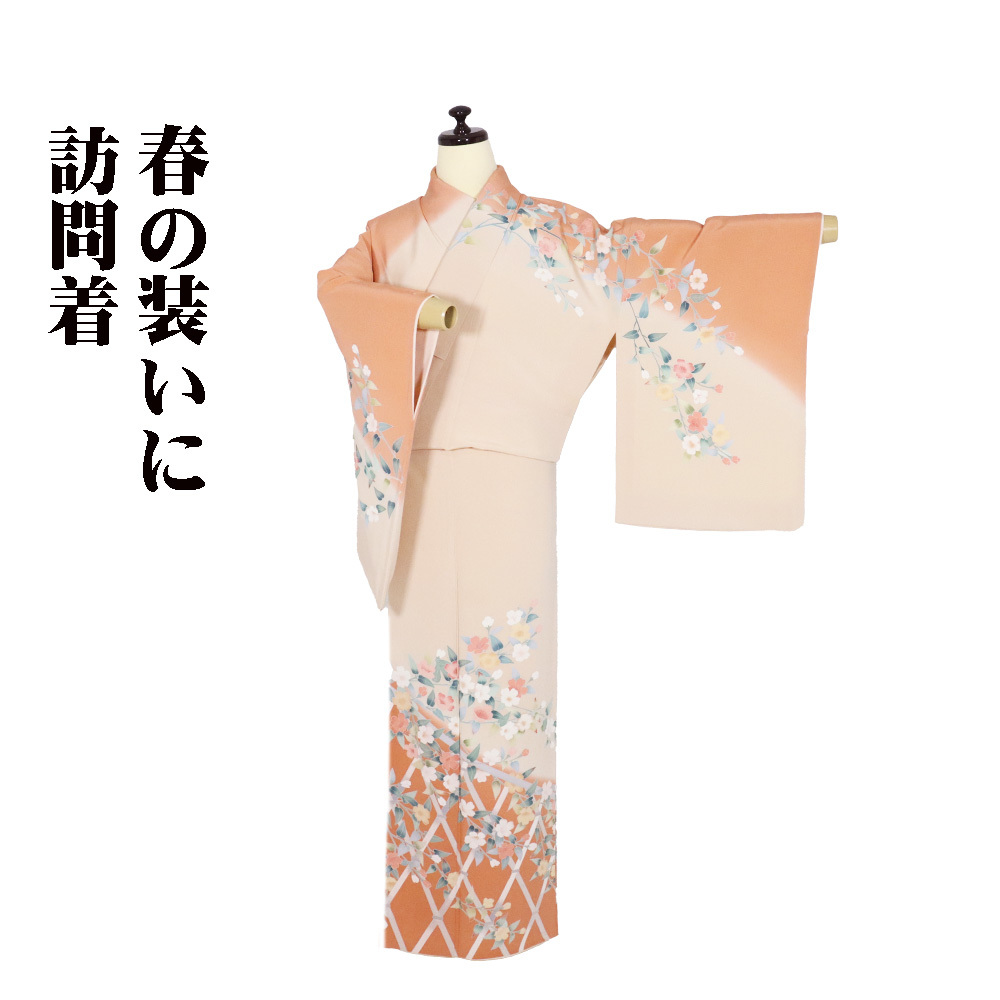 | 訪問着 袷 丹後縮緬地 ピンク(洗柿色)・赤茶(黄丹色)・暈し地 桜 162 広襟 作家落款入り | |
