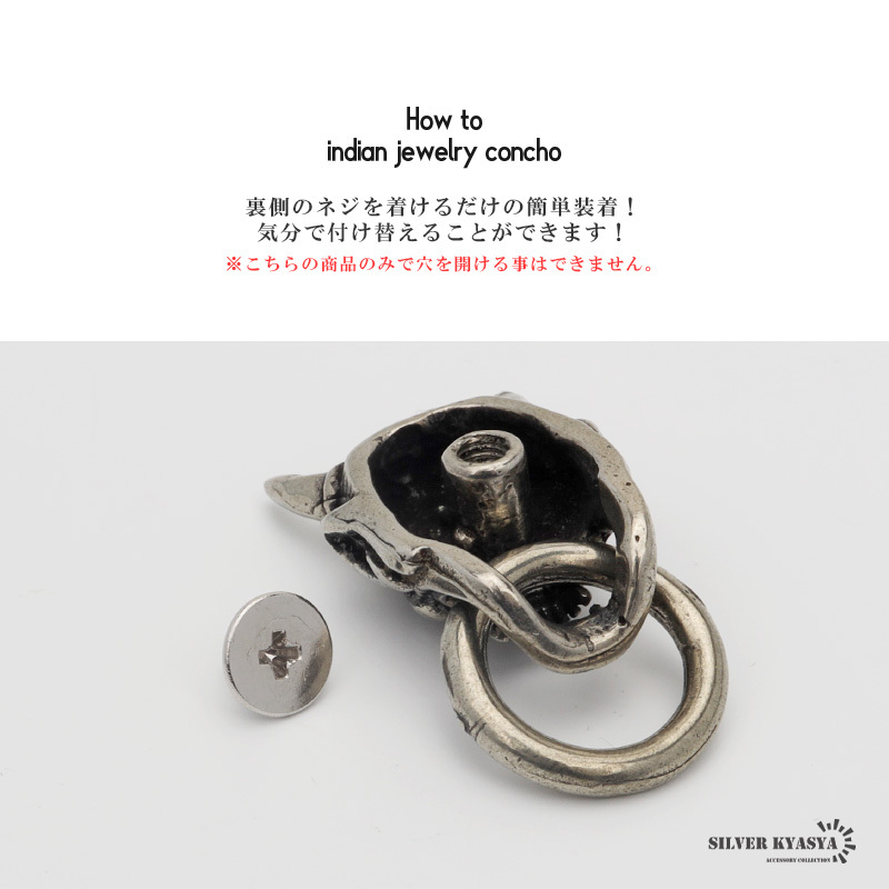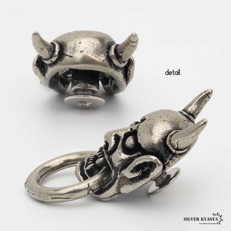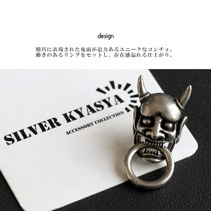 精巧に表現された鬼面が迫力あるユニークなコンチョ。動きのあるリングをセットし、存在感溢れる仕上がり。