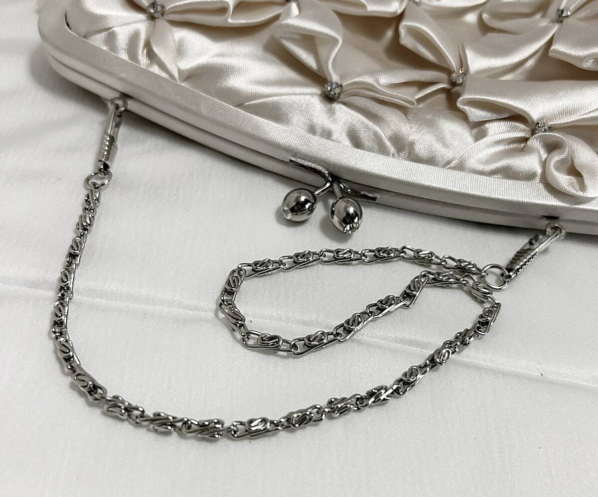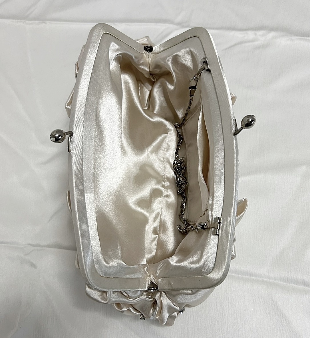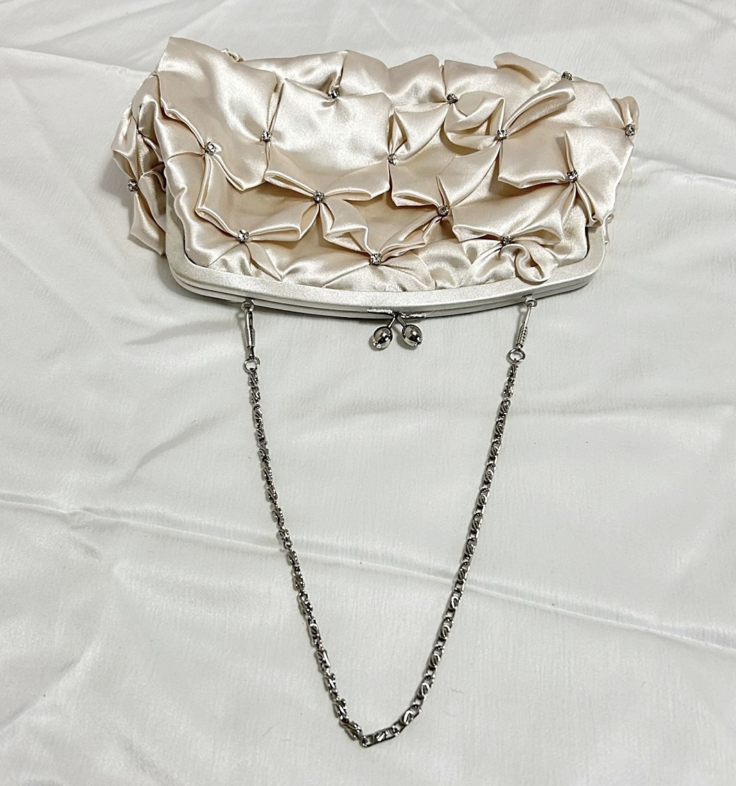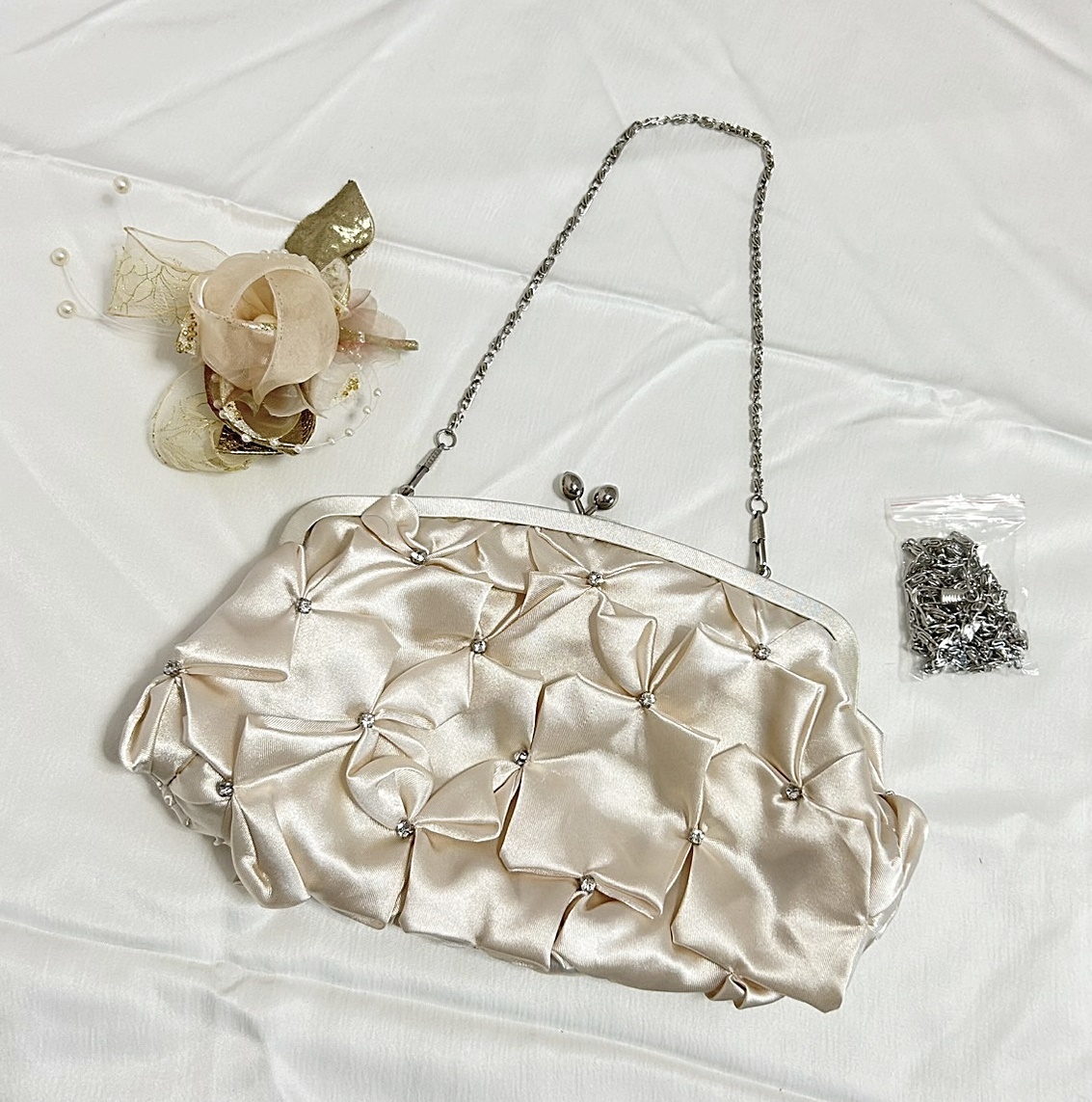 送料無料♪パーティバッグ コサージュセット 3Way クラッチ ショルダー ピンクツヤ生地 ラインストーン シルバー金具