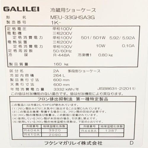 | ◇仕 様 商品名 多段オープン冷蔵ショーケース メーカー フクシマガリレイ 型 式 MEU-33GHSA3G 年 式 2021年製 外形寸法 約 幅900mm×奥行600mm×高さ1500mm 電 源 単相100V 50/60Hz 消費電力 501W 有効内容積 264L 重 量 約 160kg 付属品 ガラス棚3枚 ◇商品内容・状態 ・棚3段(ガラス棚:奥行300mm) ・通電動作を確認済みです。 ・擦り傷や落とし切れない汚れ等はありますが、比較的きれいな状態です。 ※この製品は付属の棚ダクトを使用することで弁当温度帯の15℃~20℃、チルド温度帯の5℃~7℃の2つの温度帯で設定可能です。 上段設定温度は15℃~20℃のみ、下段は5℃~7℃または、15℃~20℃となっており、庫内すべての温度を5℃~7℃へはできません。 ※※棚ダクトが不足しているため、弁当温度帯のみになります。 ※店頭販売もしておりますので、売り切れる場合が御座います。 売り切れた場合は、迅速にペ-ジの更新をするよう心掛けておりますが、リアルタイムではございません。 出品商品が完売している場合もありますのでご了承ください。 商品に関しまして、お気軽にお問合わせ下さい。 |