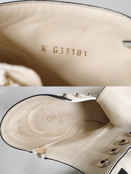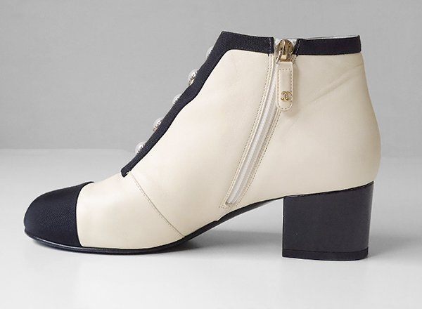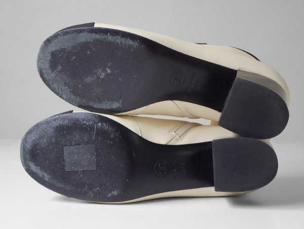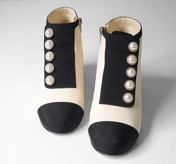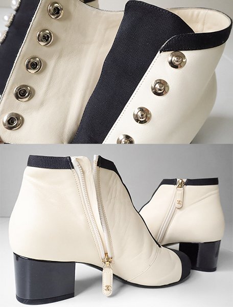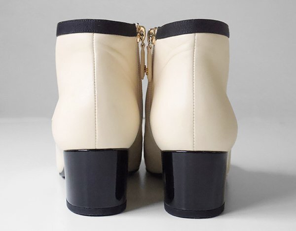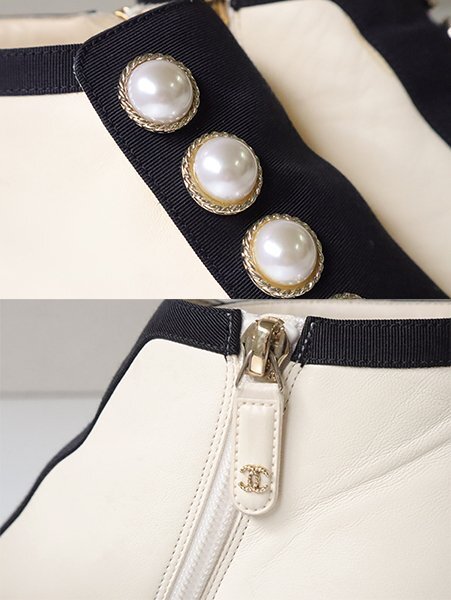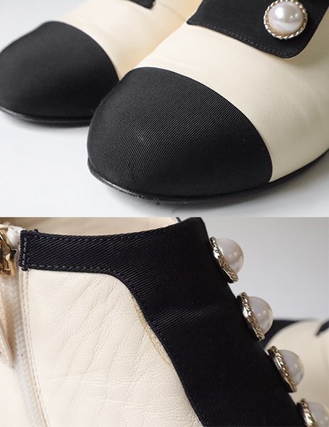 CHANEL ◆ 上品パール バイカラー ( アイボリー×ブラック ) レザー ヒール ショートブーツ 37 / 約24cm サイドジップ シャネル ◆61/K-2