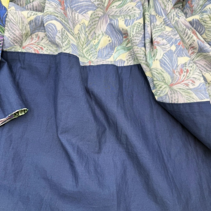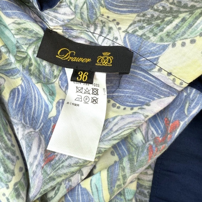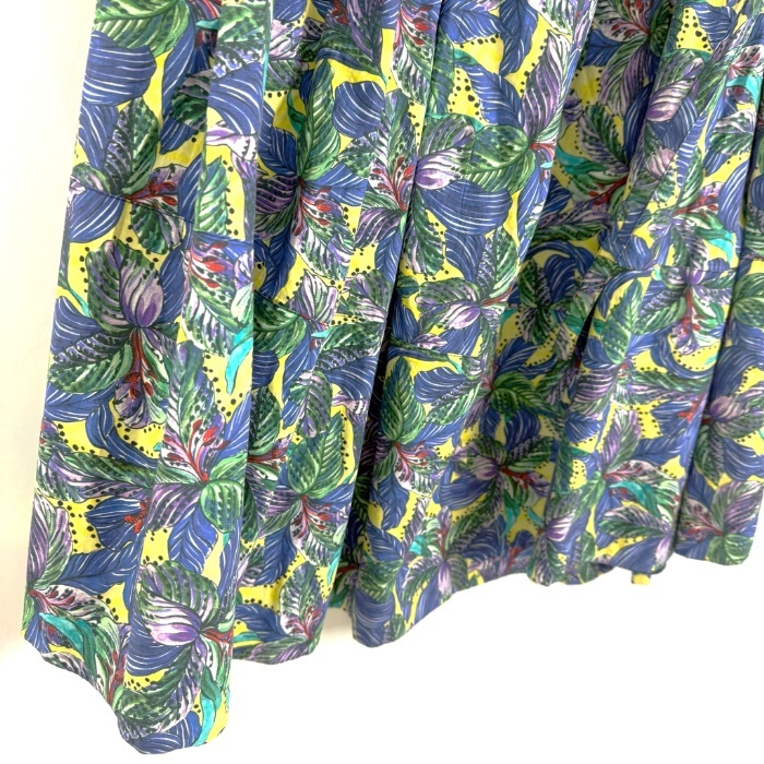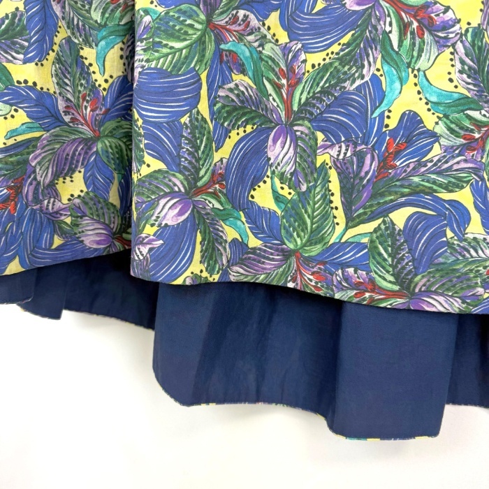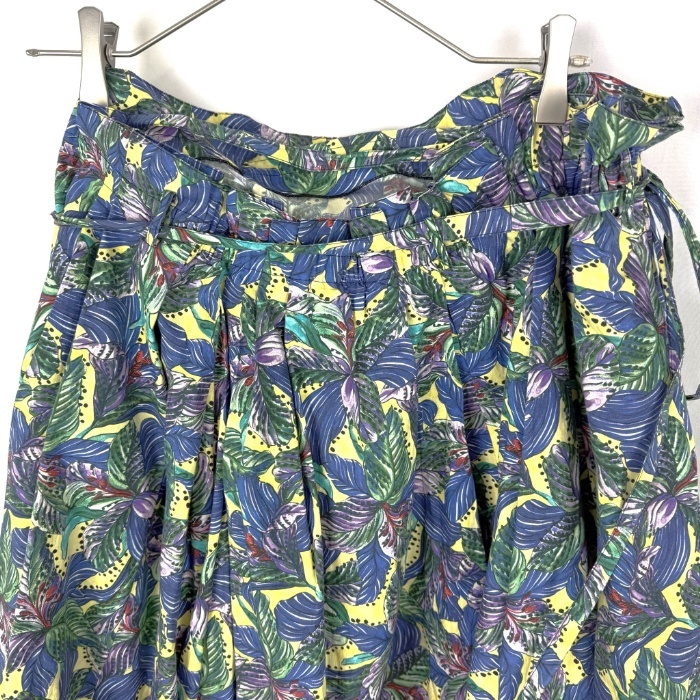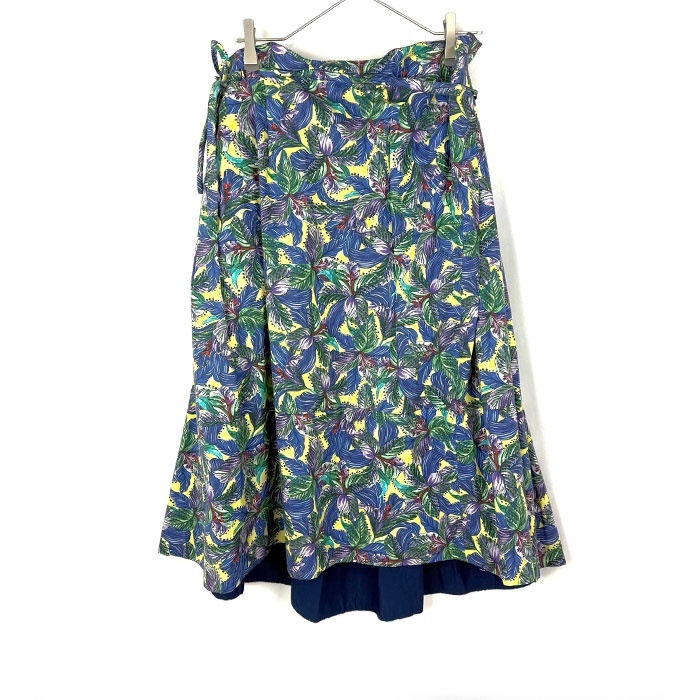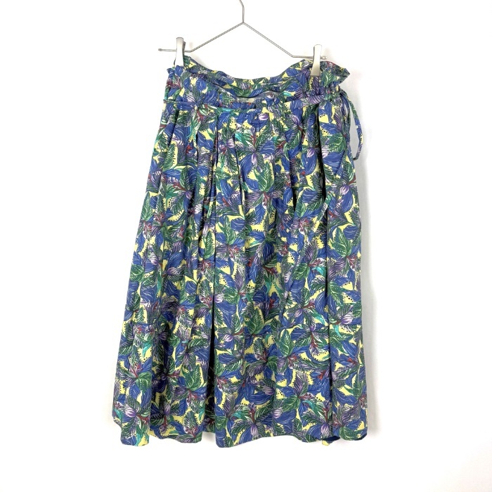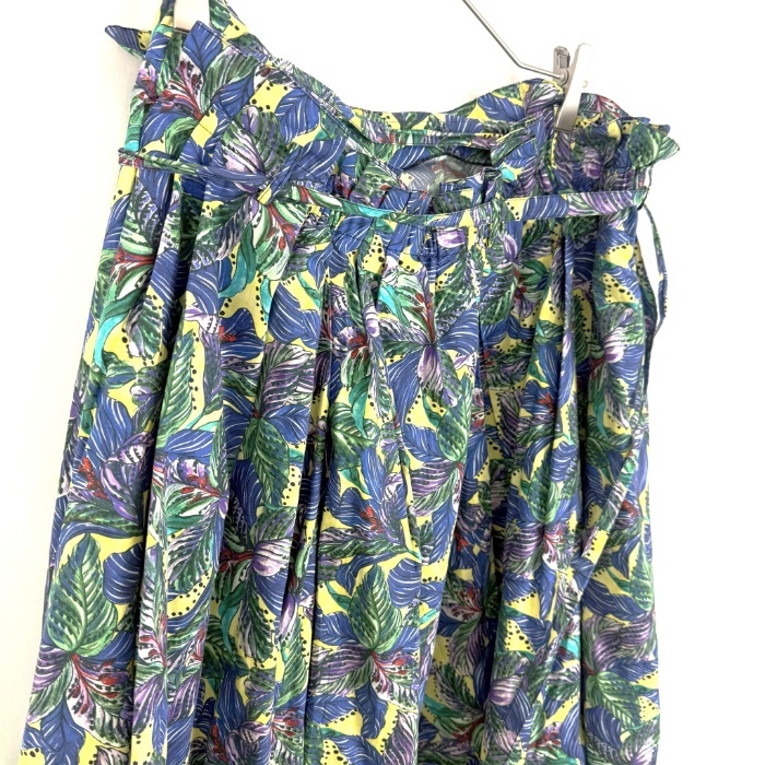 【コメント】 綺麗な色味のボタニカル柄フレアスカートです。ウエストはゴム×紐で、紐調節でき巻きスカートのようなデザインになります。うっすら色褪せ感がありますが、気になる汚れはなく全体的に綺麗なお品物です。 |