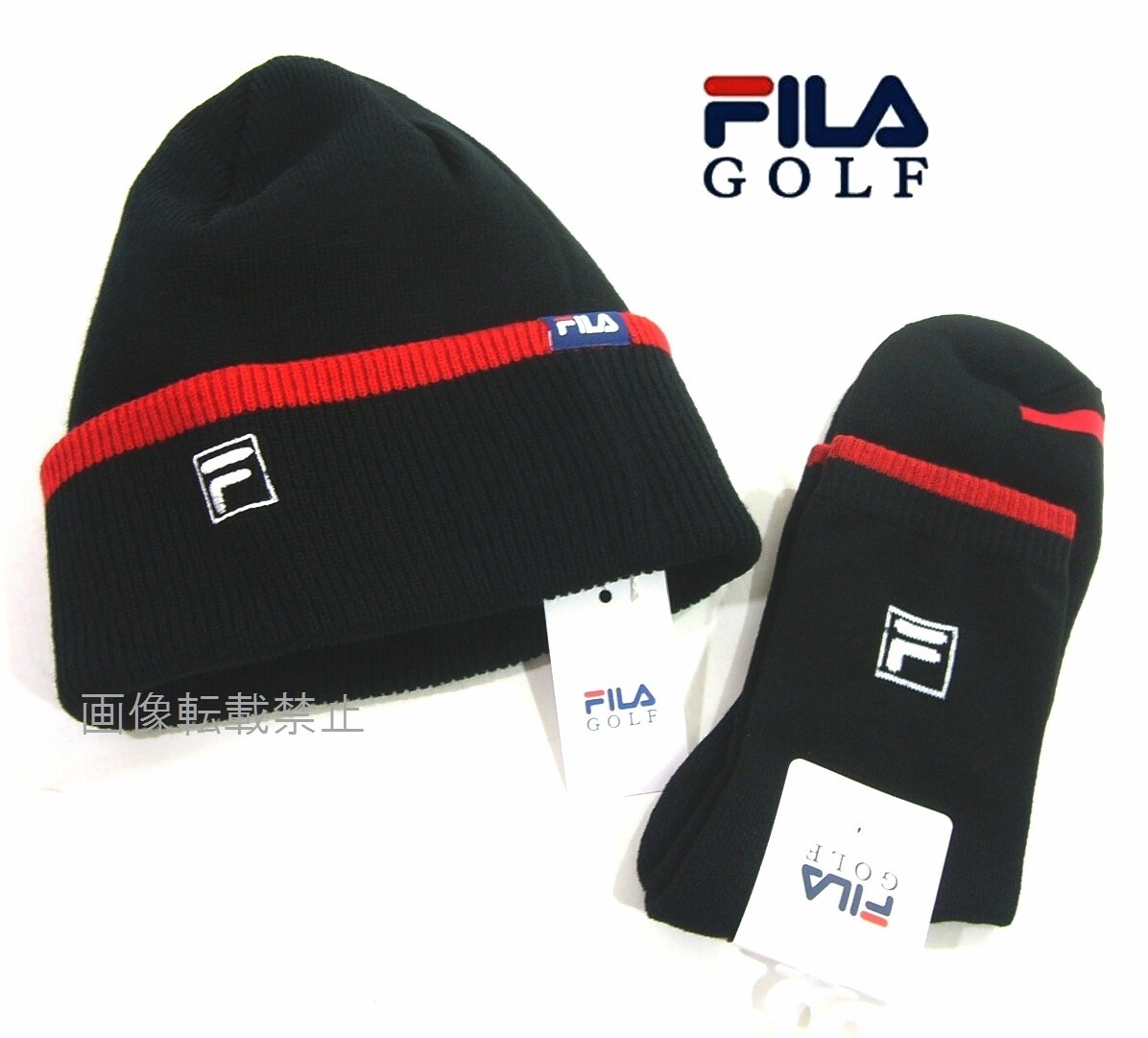 新品 秋冬ゴルフ フィラゴルフ 小物2点セット ニットキャップ&ソックス 黒赤 ブラック ニット帽&靴下 FILA GOLF
