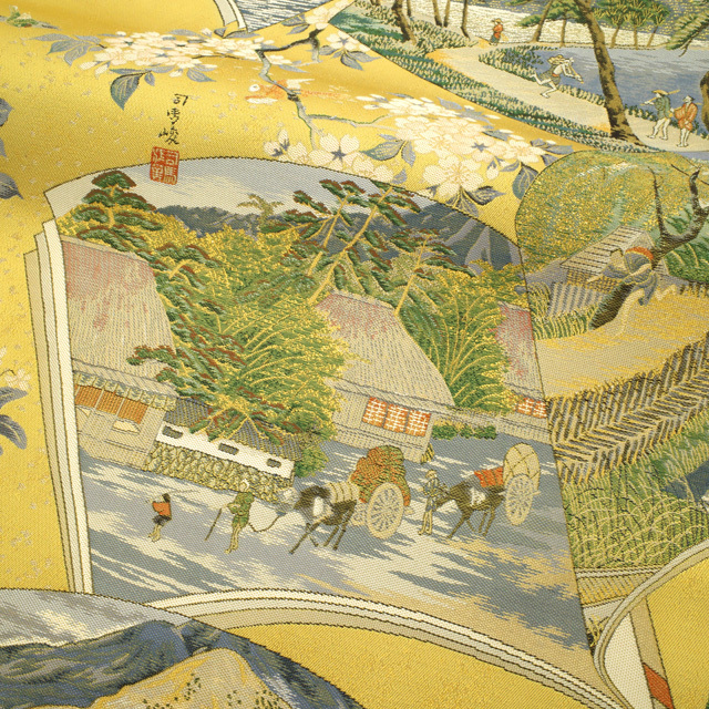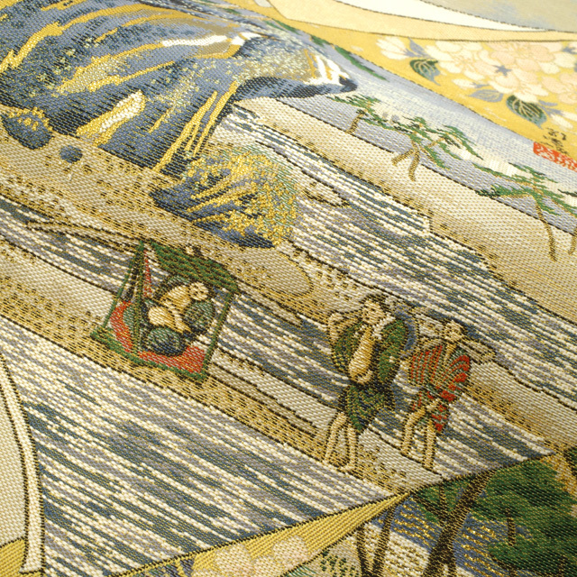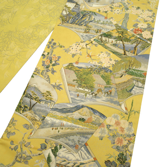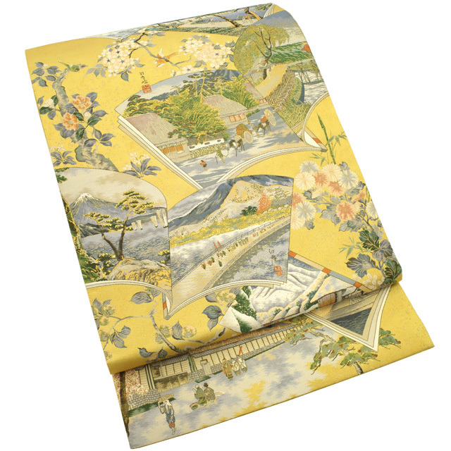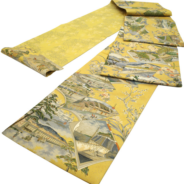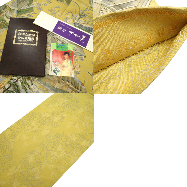 【新古品】 すごい値! 袋帯 未使用 フォーマル 京都 西陣 正絹 全通 司馬江漢 壱阡八百口織 ジャスミンイエロー 薄黄 東海道五拾三次 梅 菊 桜 鳥 純金箔 プラチナ 仕立て上がり 春 秋 冬 未使用 さが美 扱い あさぎ フォーマル帯 結婚式 入学式 卒業式 七五三 お祝い パーティー などのフォーマルな場面に たとう紙付き 送料無料 販売 購入 綺麗 美品 リサイクル すごいね みやがわ neb01308