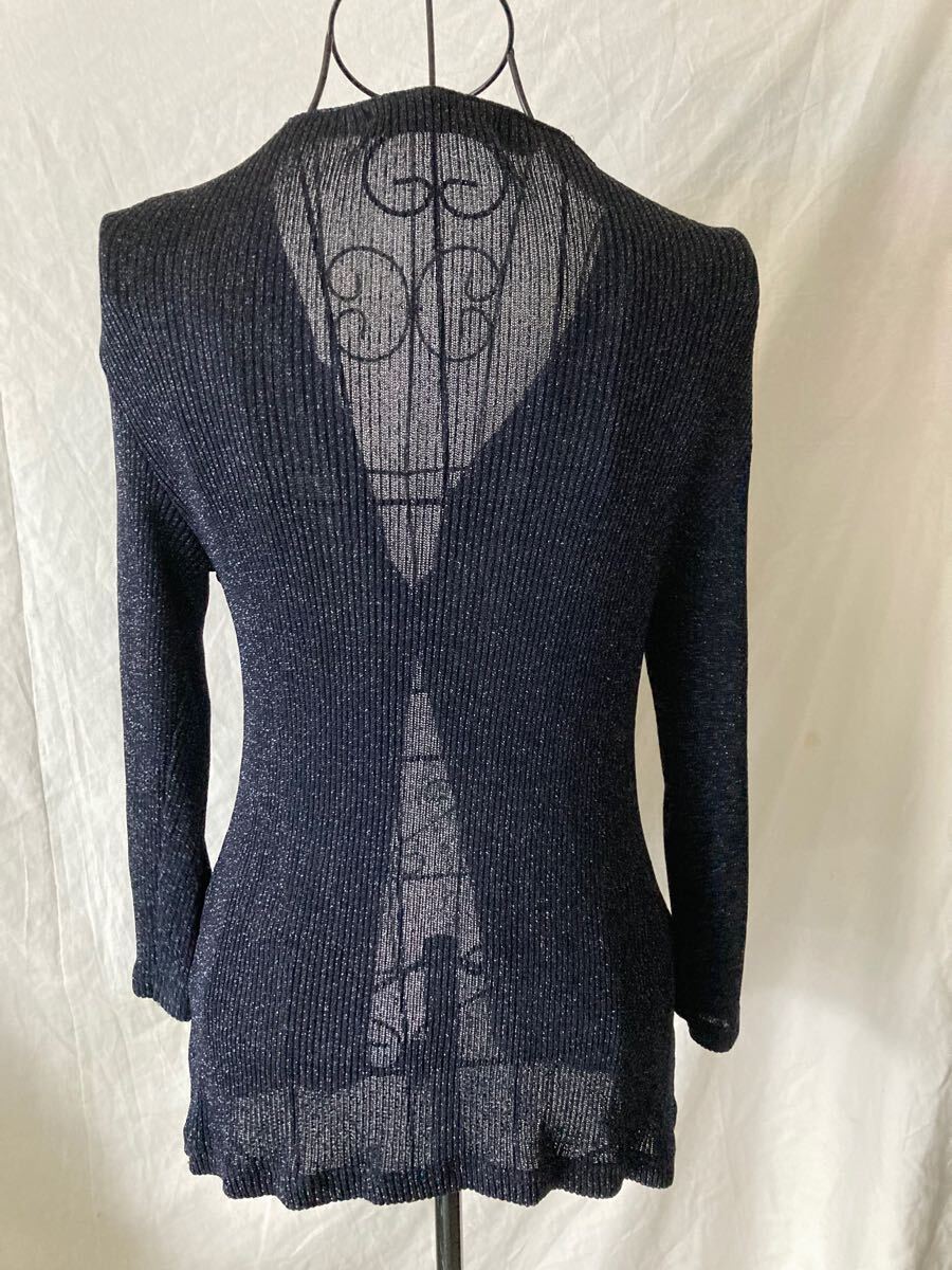 O-TWOBROSオーツブロス リブ編みのダークネイビー七分袖カーディガン、Vネックの背面デザインが特徴。