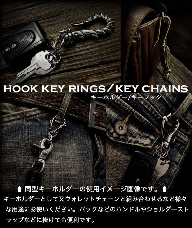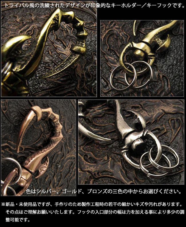 トライバルなハードデザインがクールなキーホルダー/キーフックです。細部までこだわったデザインでお洒落のワンポイントにおすすめアイテムです。個性的なキーフックをお探しの方におすすめ商品です。根元部分は回転しますのでウォレットチェーンなど装着してもねじれません。