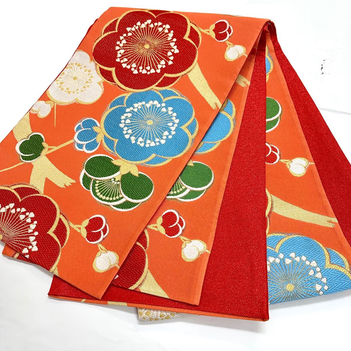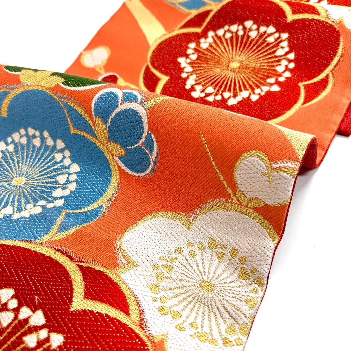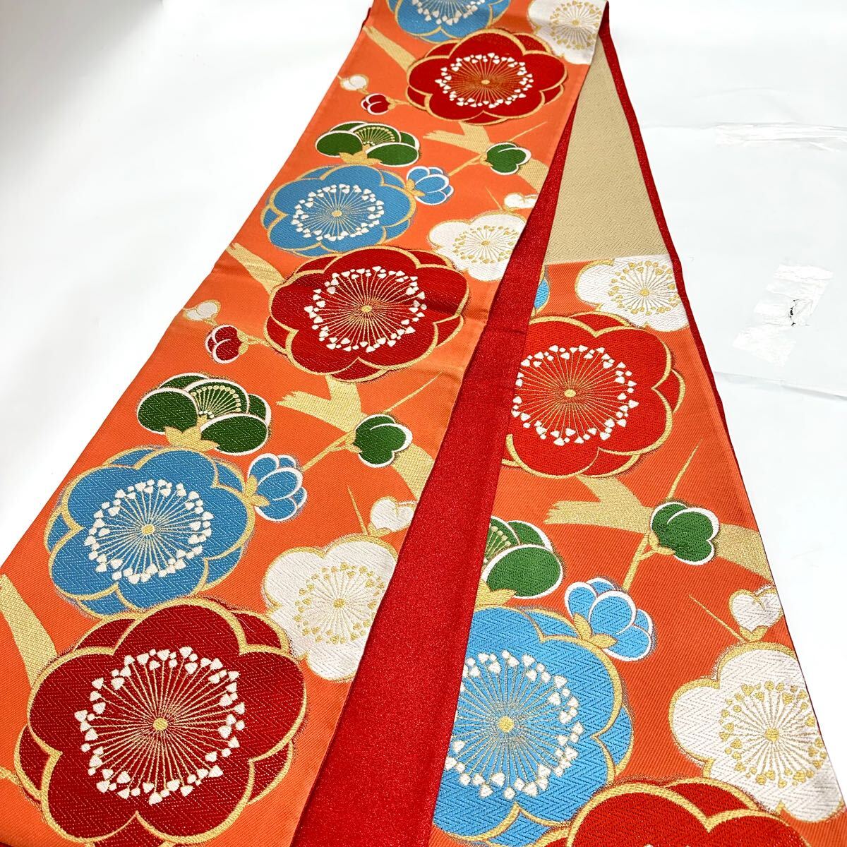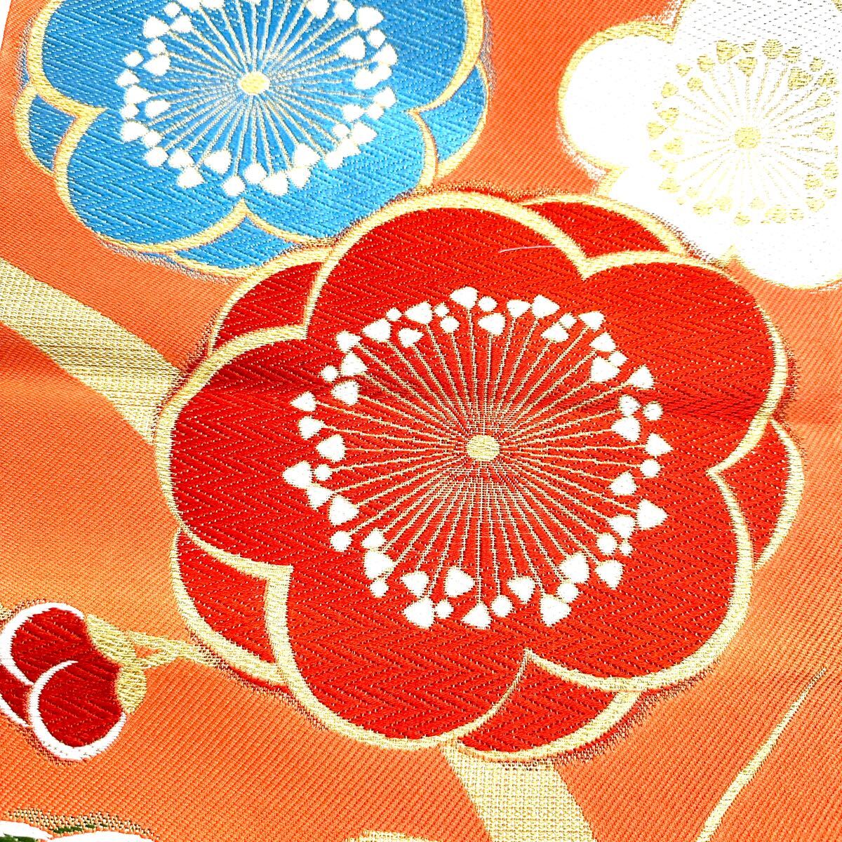 【七福】c425 振袖用帯 豪華 高級品 正絹 袋帯 六通 金糸 オレンジ色に梅 華やか 成人式 結婚式 お祝い