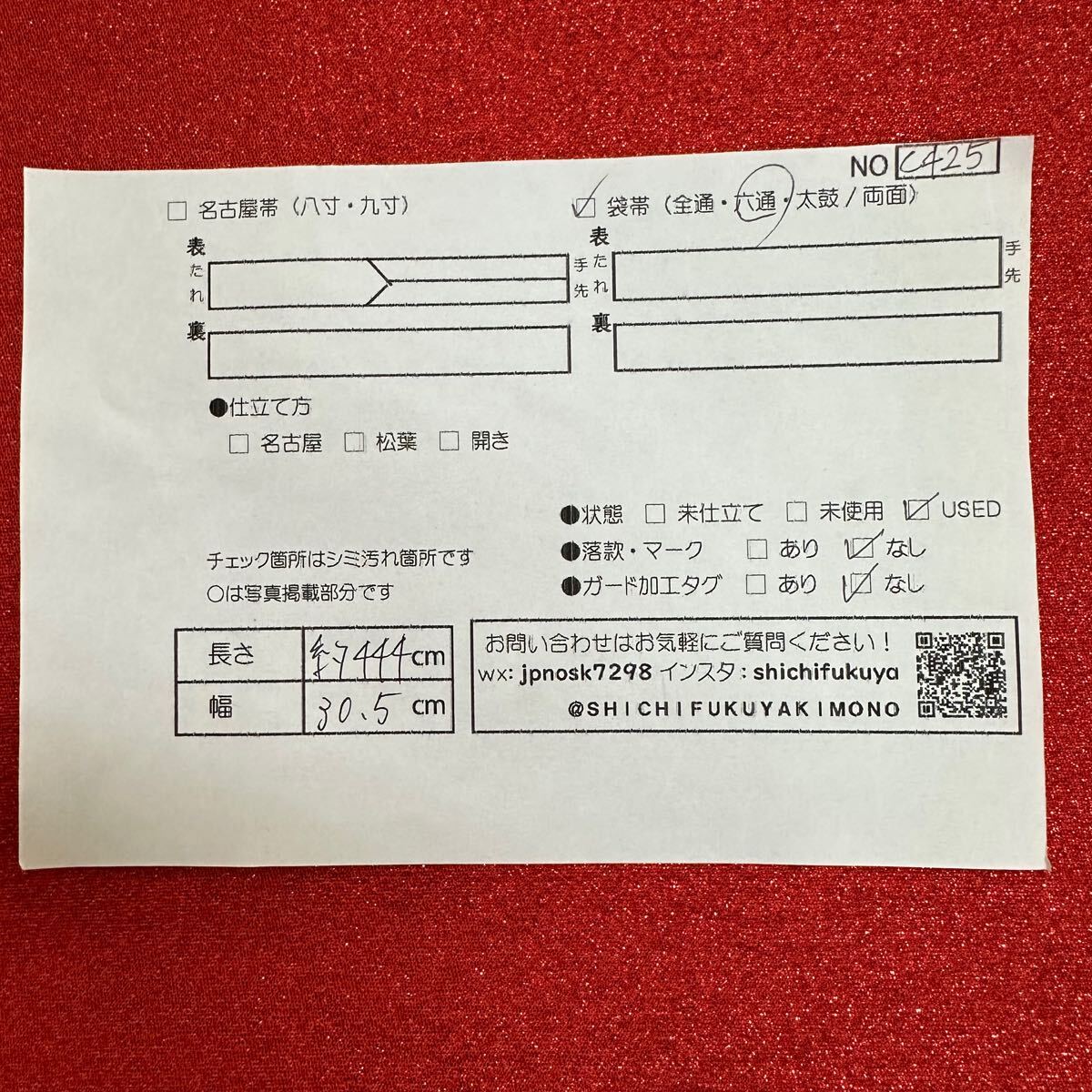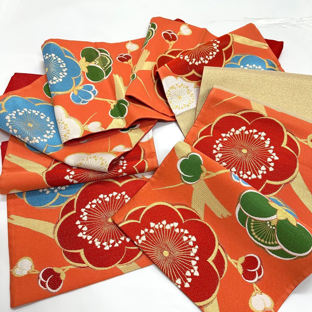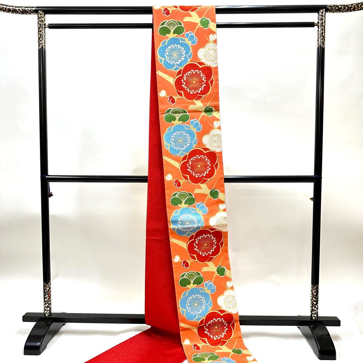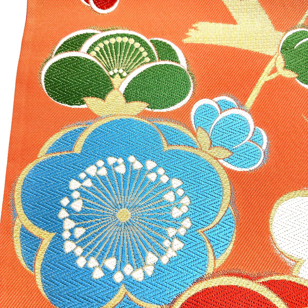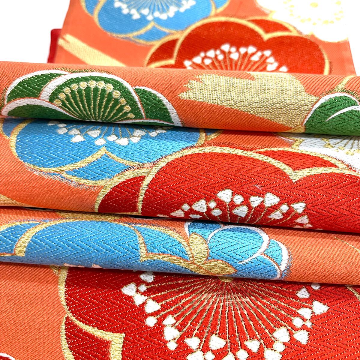 【七福】c425 振袖用帯 豪華 高級品 正絹 袋帯 六通 金糸 オレンジ色に梅 華やか 成人式 結婚式 お祝い
