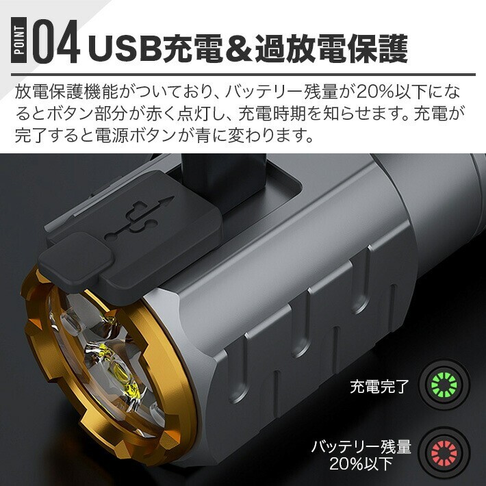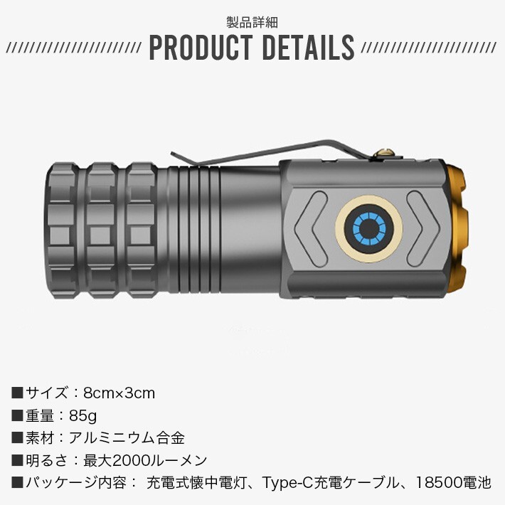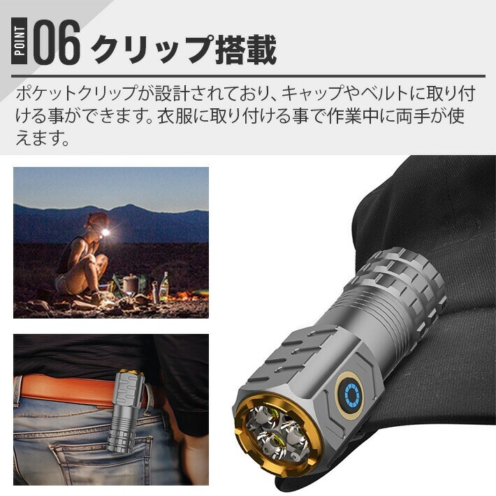 懐中電灯のスイッチと充電ポートはシリコンスリーブでしっかりと密閉し、防水性を確保しています。本体はアルミニウム合金CNCで製造され、頑丈です。また、ポケットクリップが設計されており、走っても落としません。