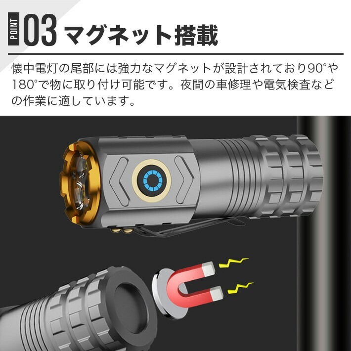 懐中電灯の尾部には強力なマグネットが設計されており、90°や180°で物に取り付け可能です。夜間の車修理や電気検査などの作業に適しています。マグネットを組み合わせることで、両手を完全に解放できます。